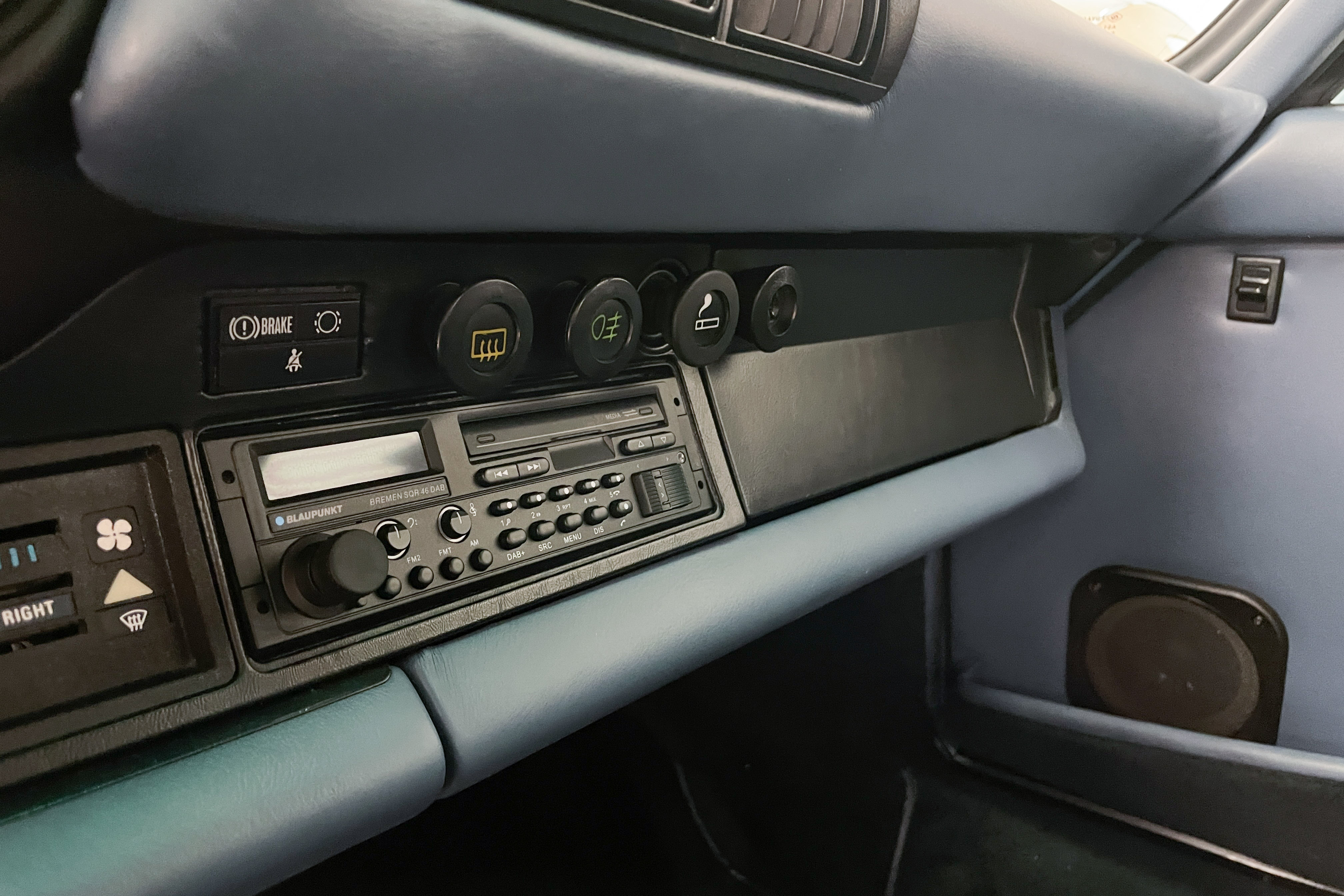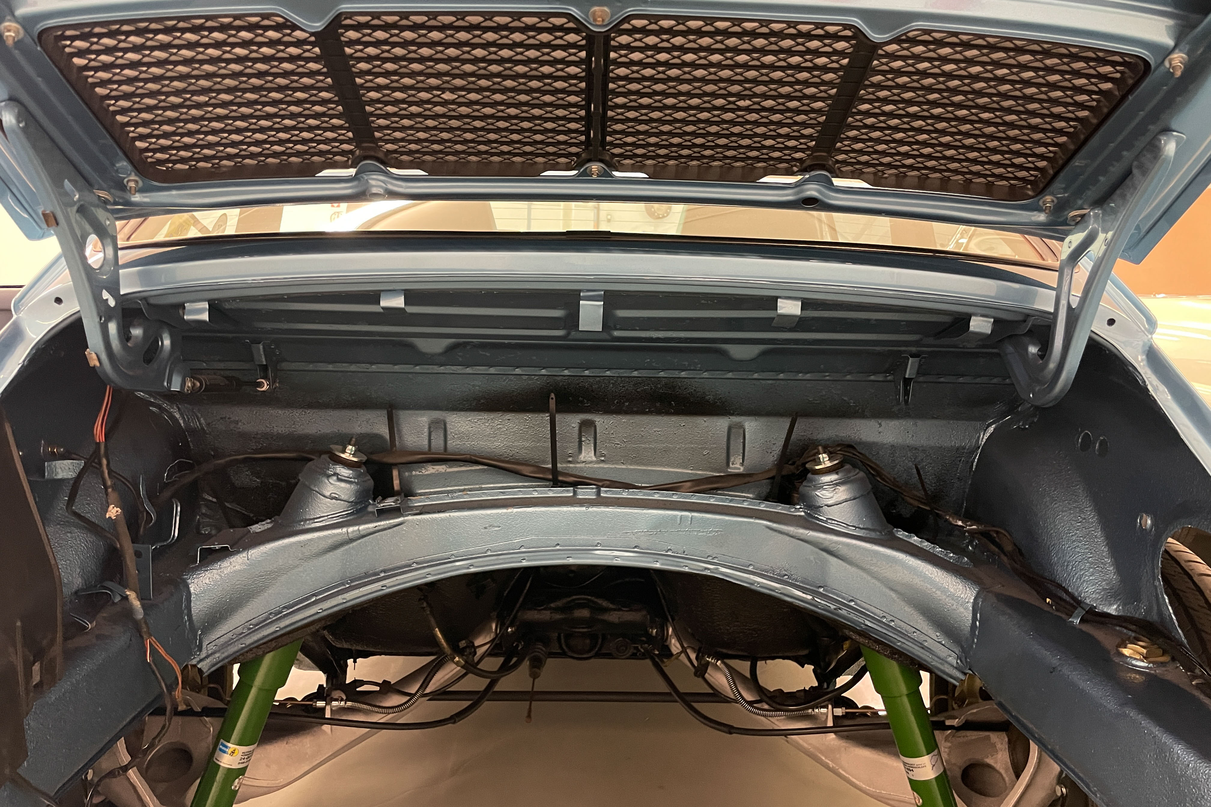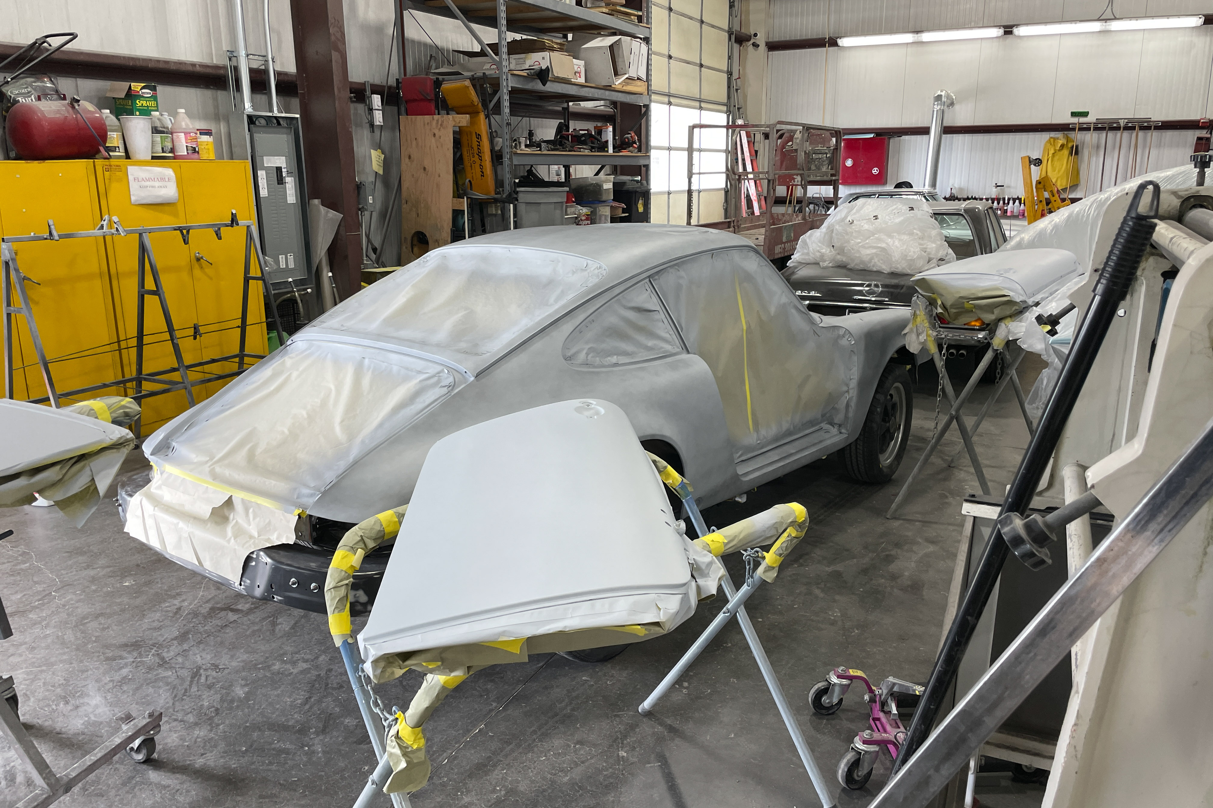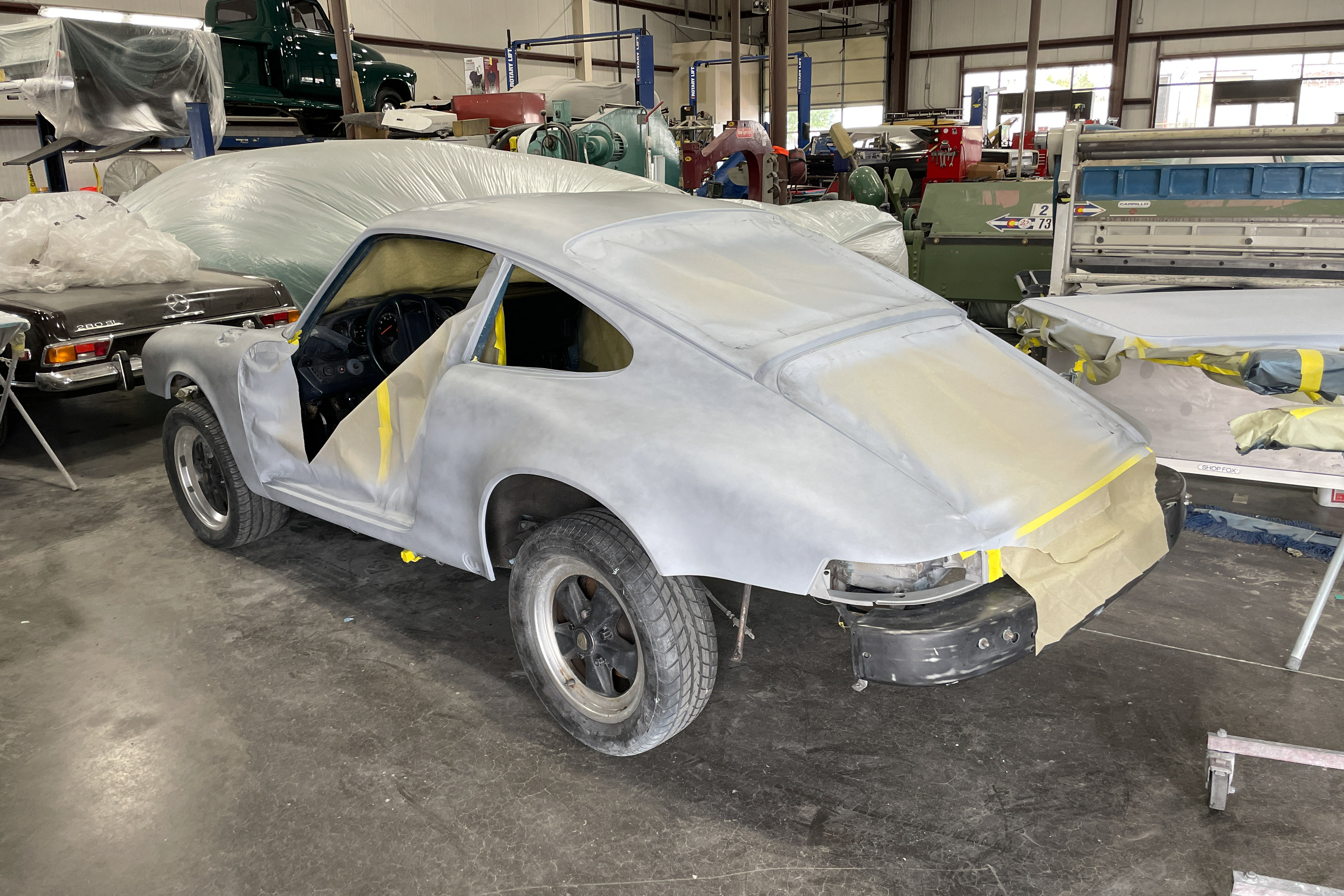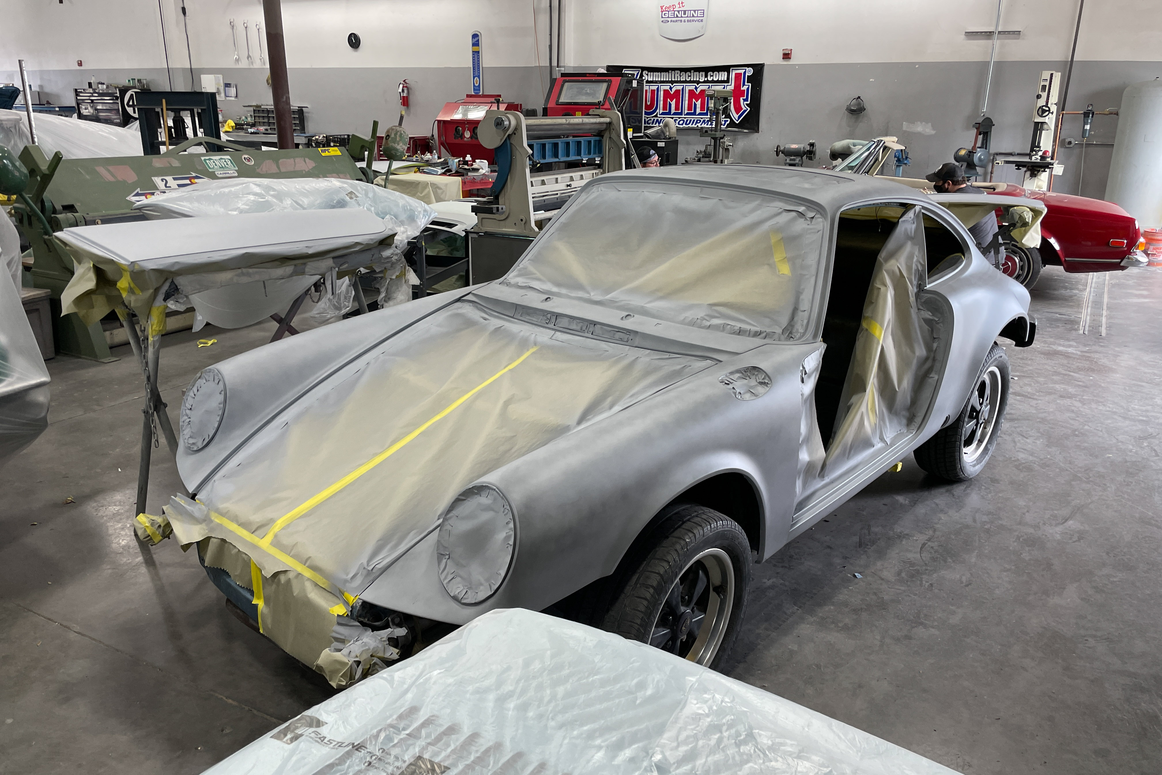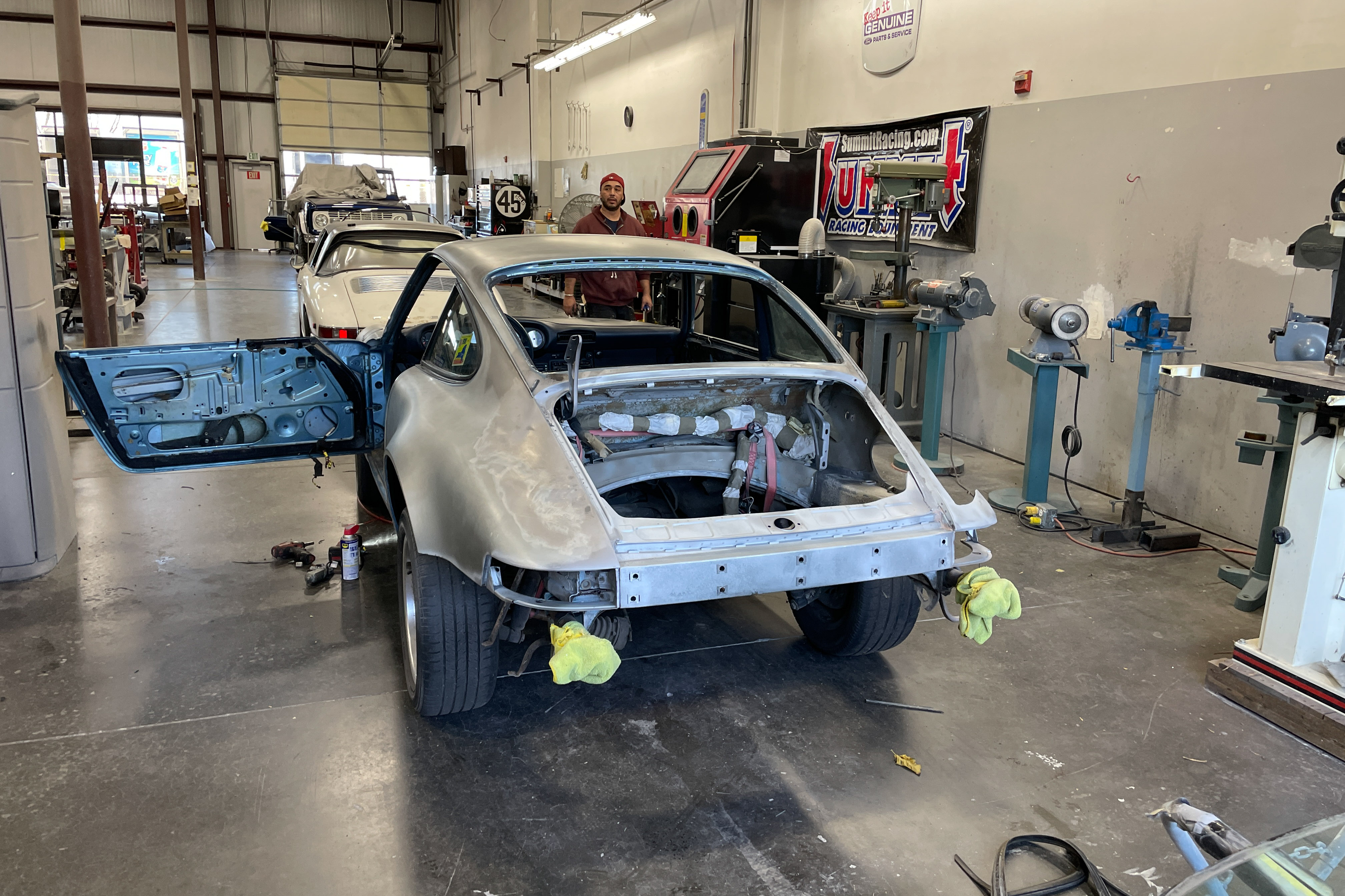 Next was extensive bodywork and metal. Followed by primer, paint, sanding, clear and more sanding. The Porsche factory Iris Blue came out great. Matching the exterior is a Porsche blue leather interior. Every last bit factory correct. There is endless detail work, especially on classic Porsche restorations. Also, remember that this car is going to Moment Motors in Texas to be converted to electric battery and motor. It’s already been there once – getting wiring in place and a lot more.
