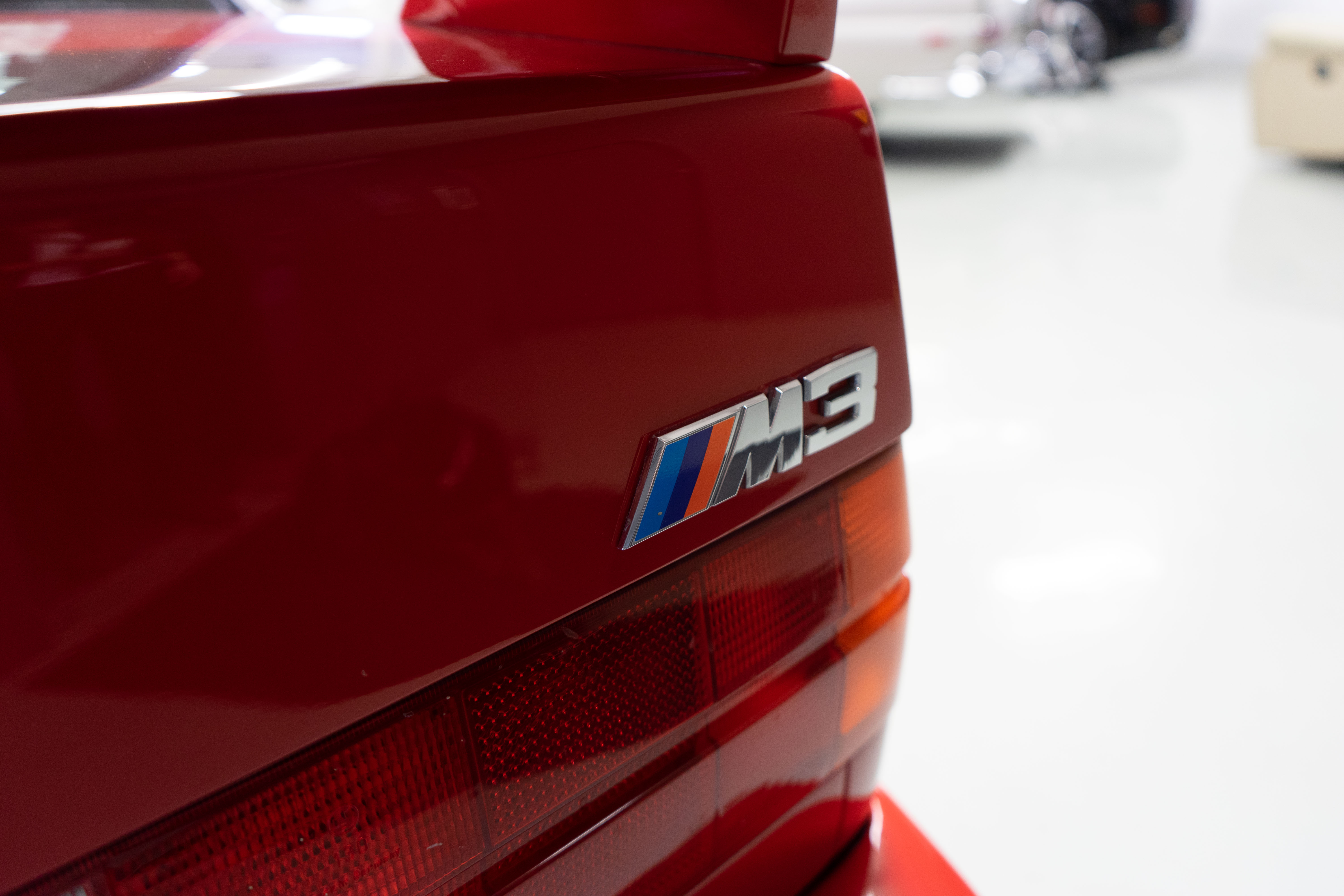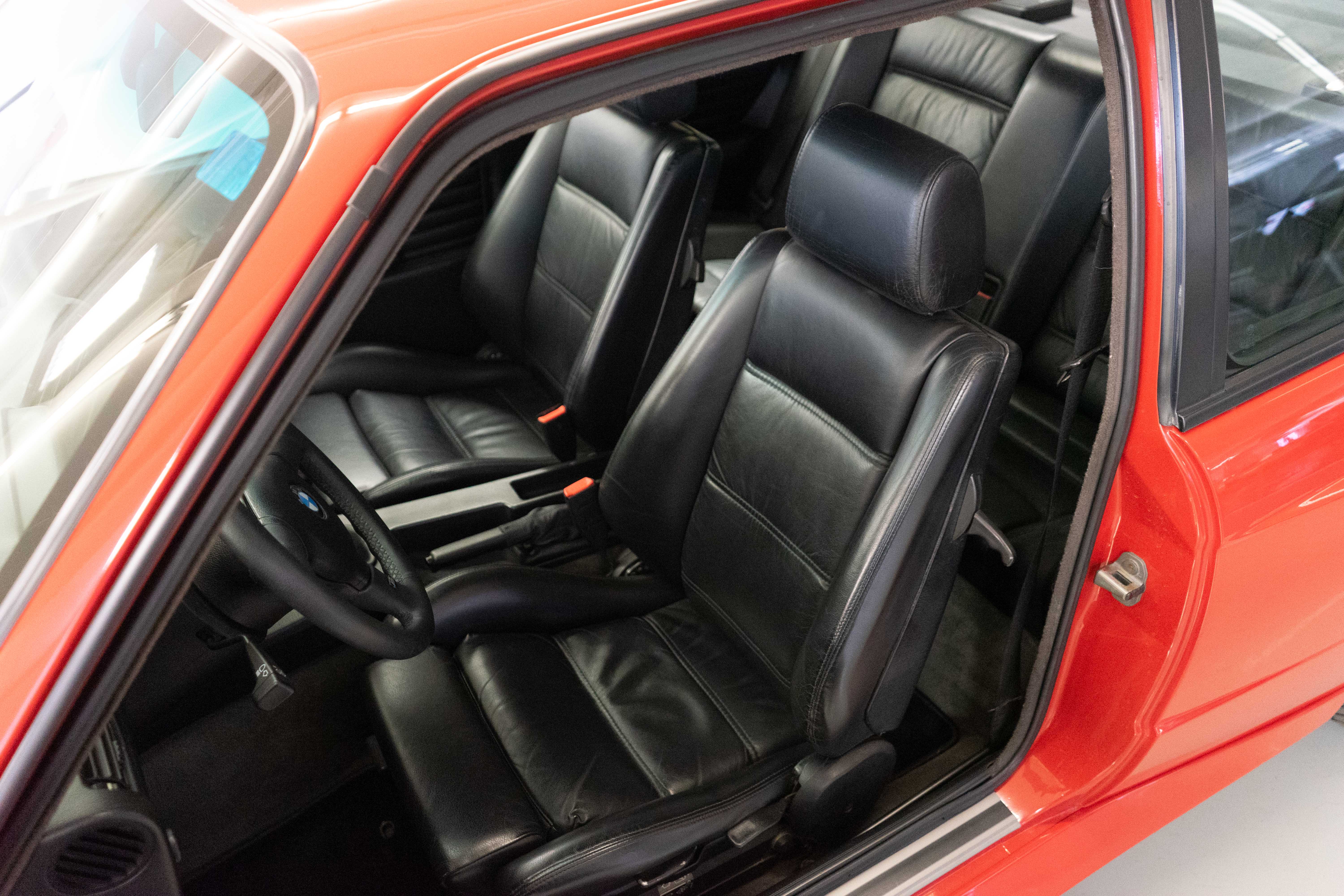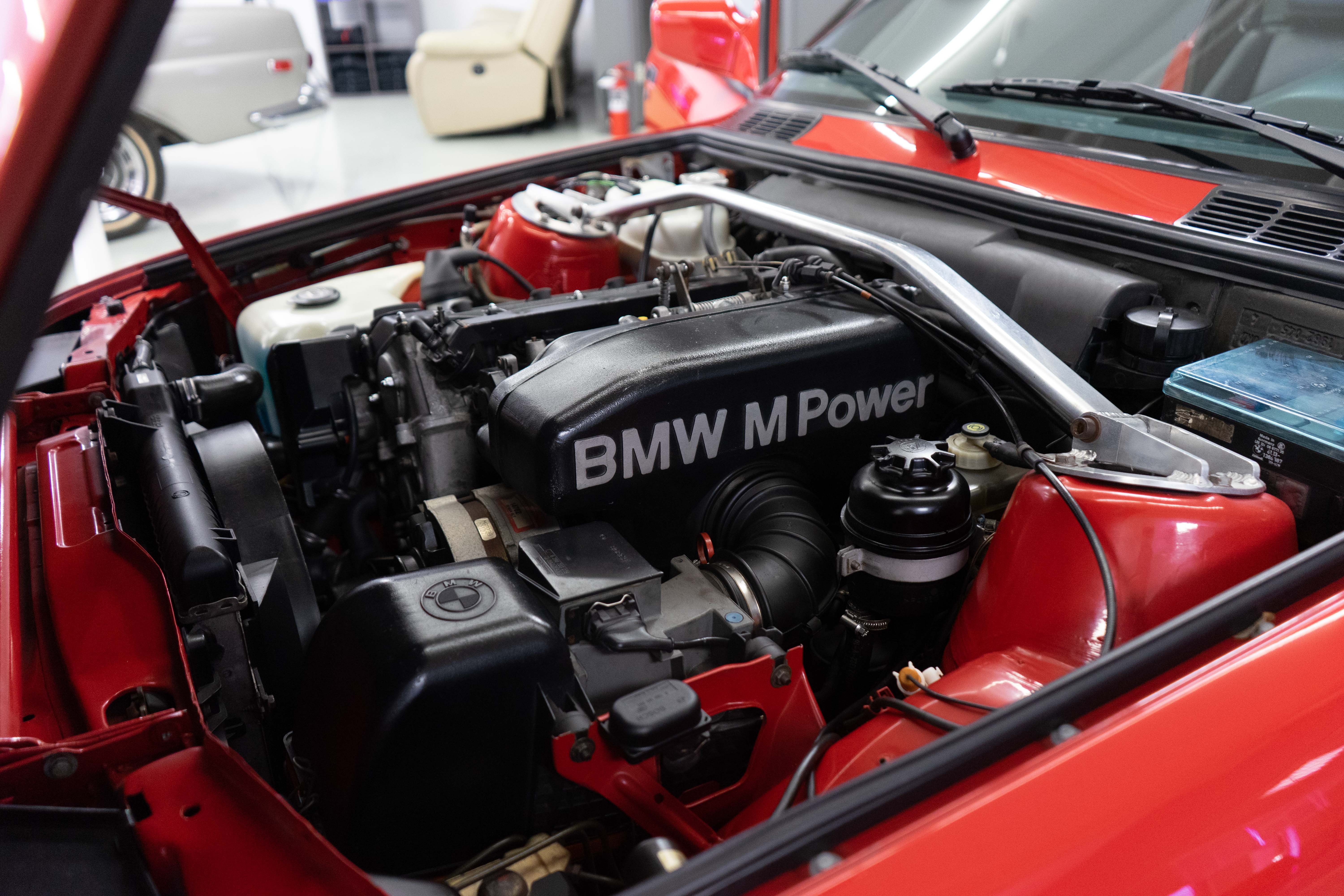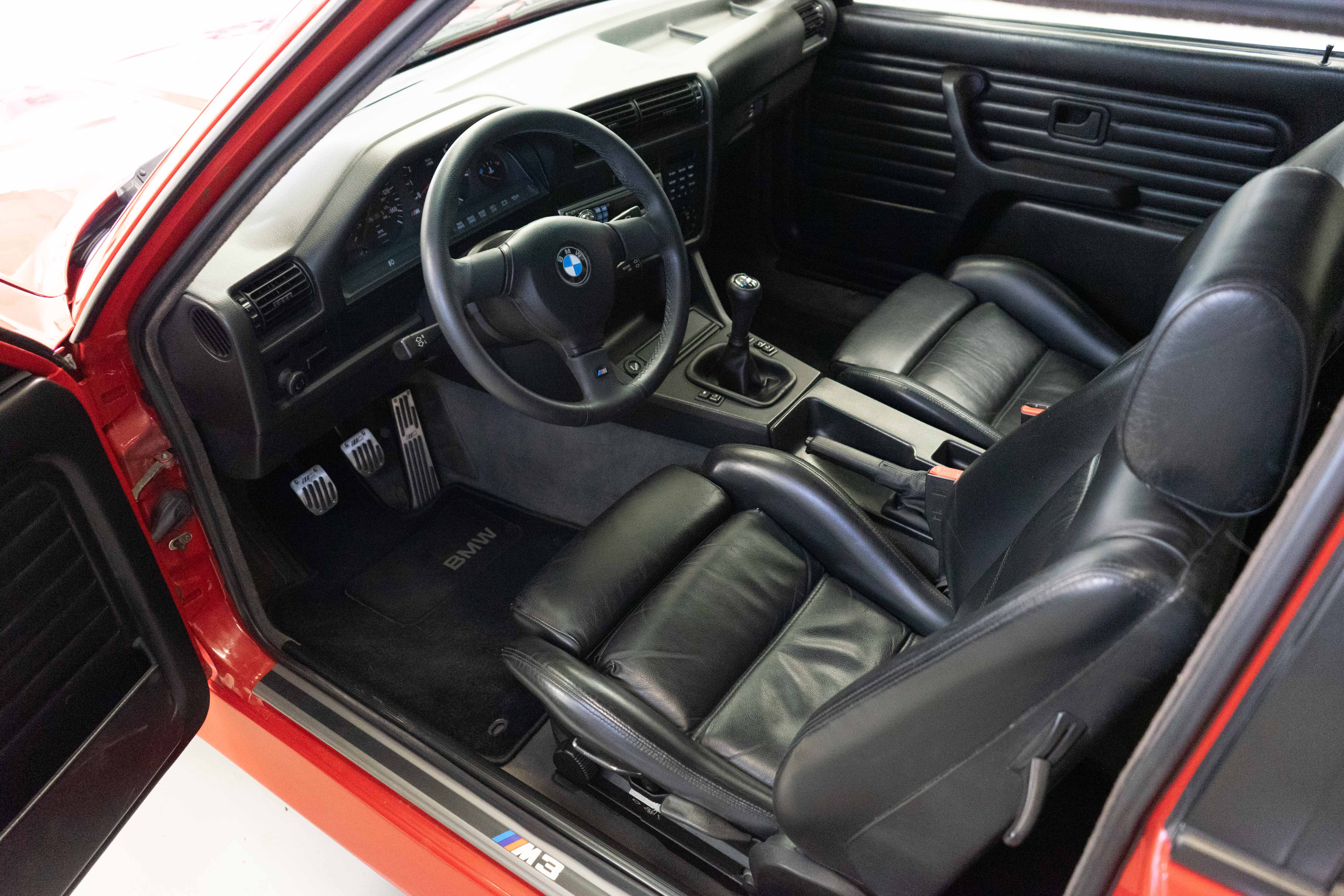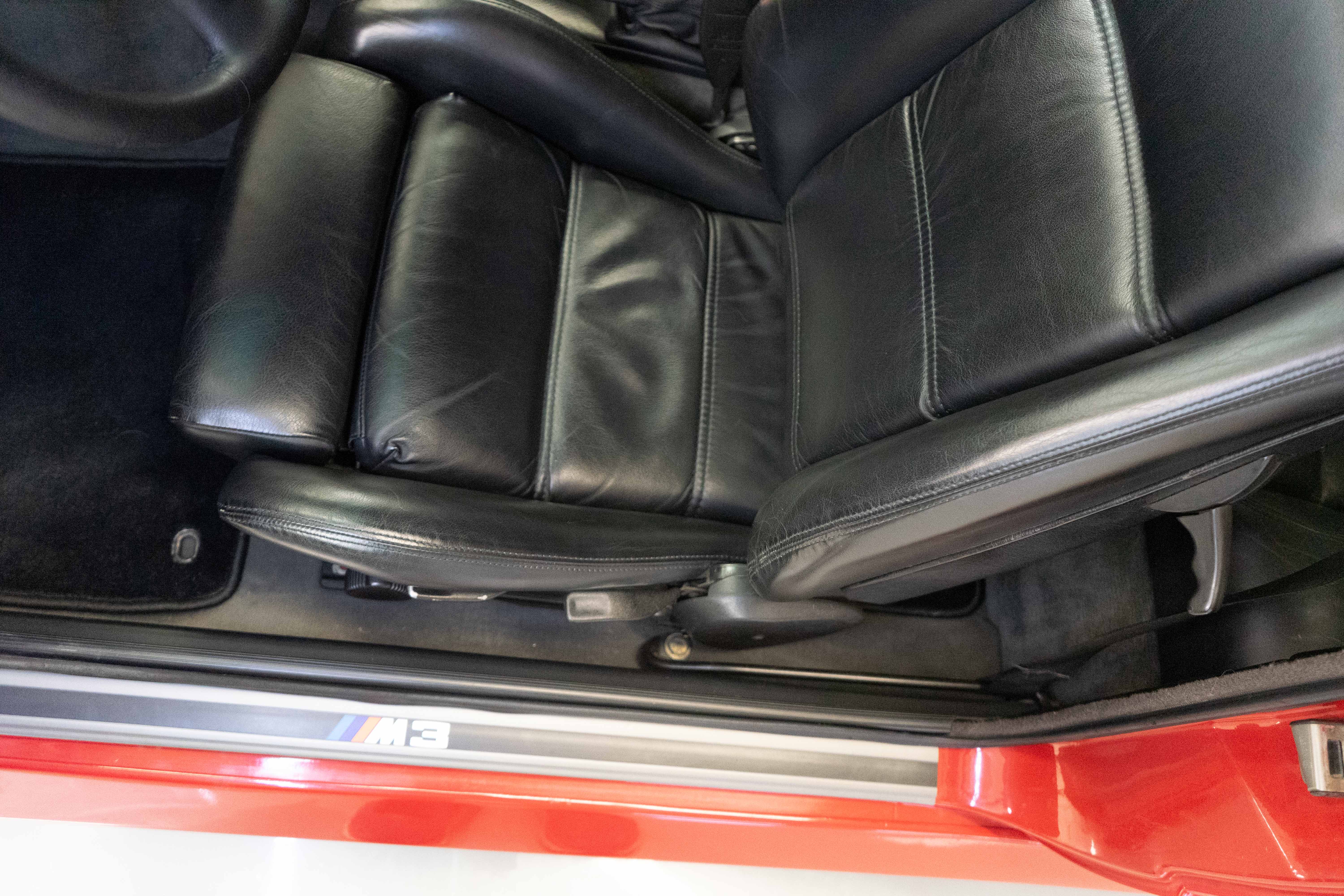 This example is a 1989 E30 M3 finished in Cinnabar Red with a black leather interior. This M3 currently shows just over 108,000 miles on the odometer and is a great ‘drivers’ example. The car has minor bolt-on modifications including a front strut crossmember, an aftermarket cat-back exhaust, and an Alpine radio. The paint is consistent throughout the car and shows minor indications of a previous repaint. Inside, the leather interior is consistent with only minor signs of use.