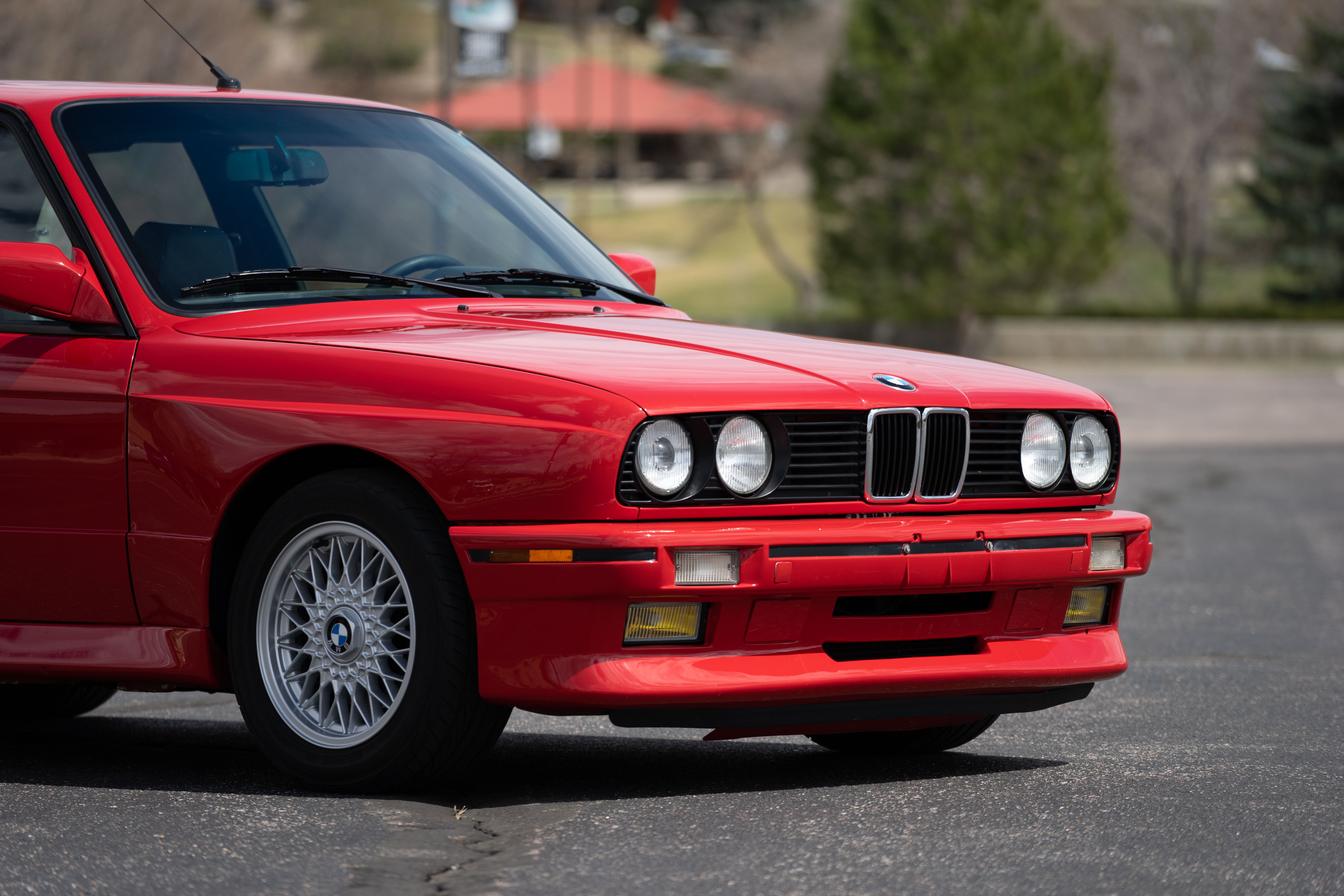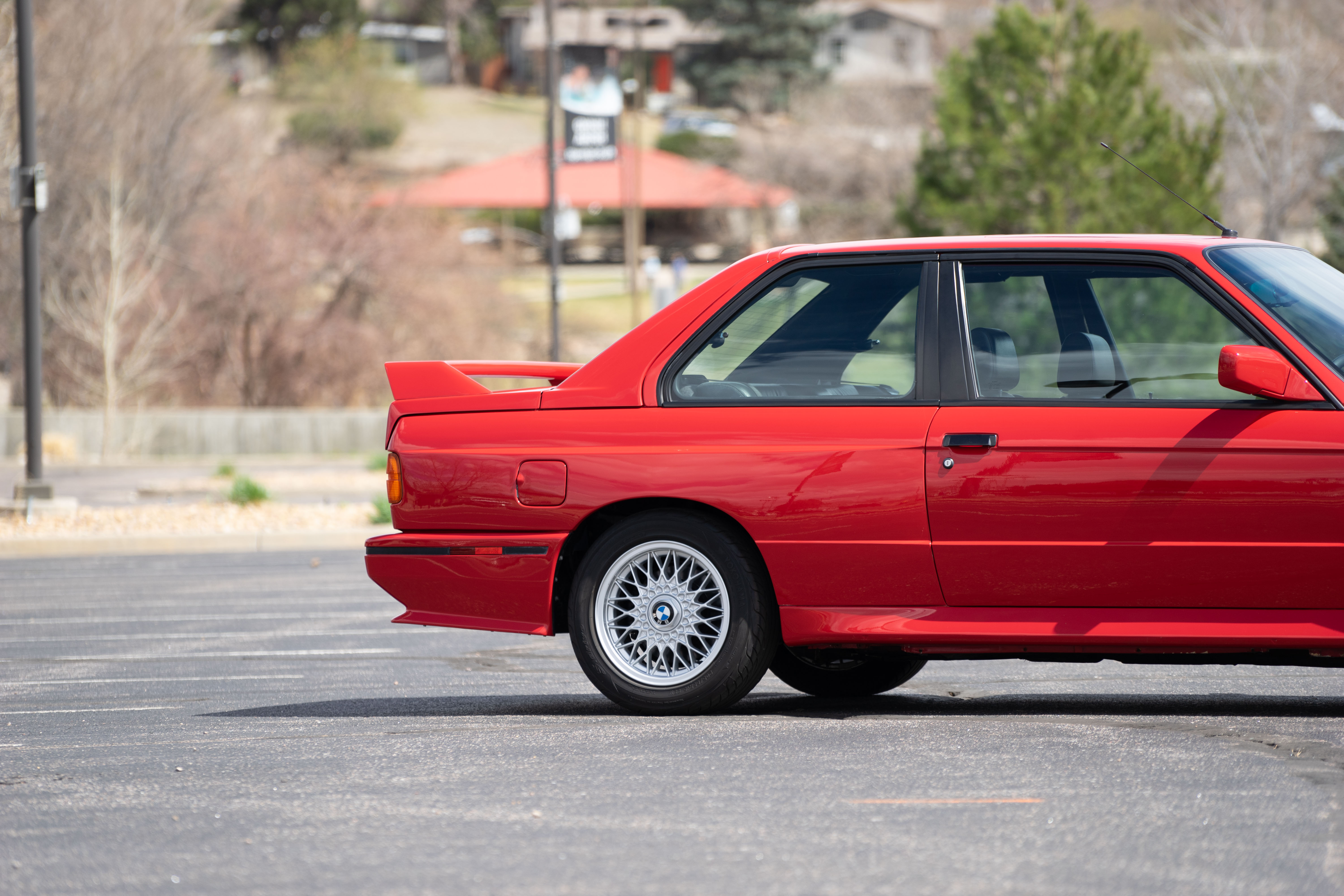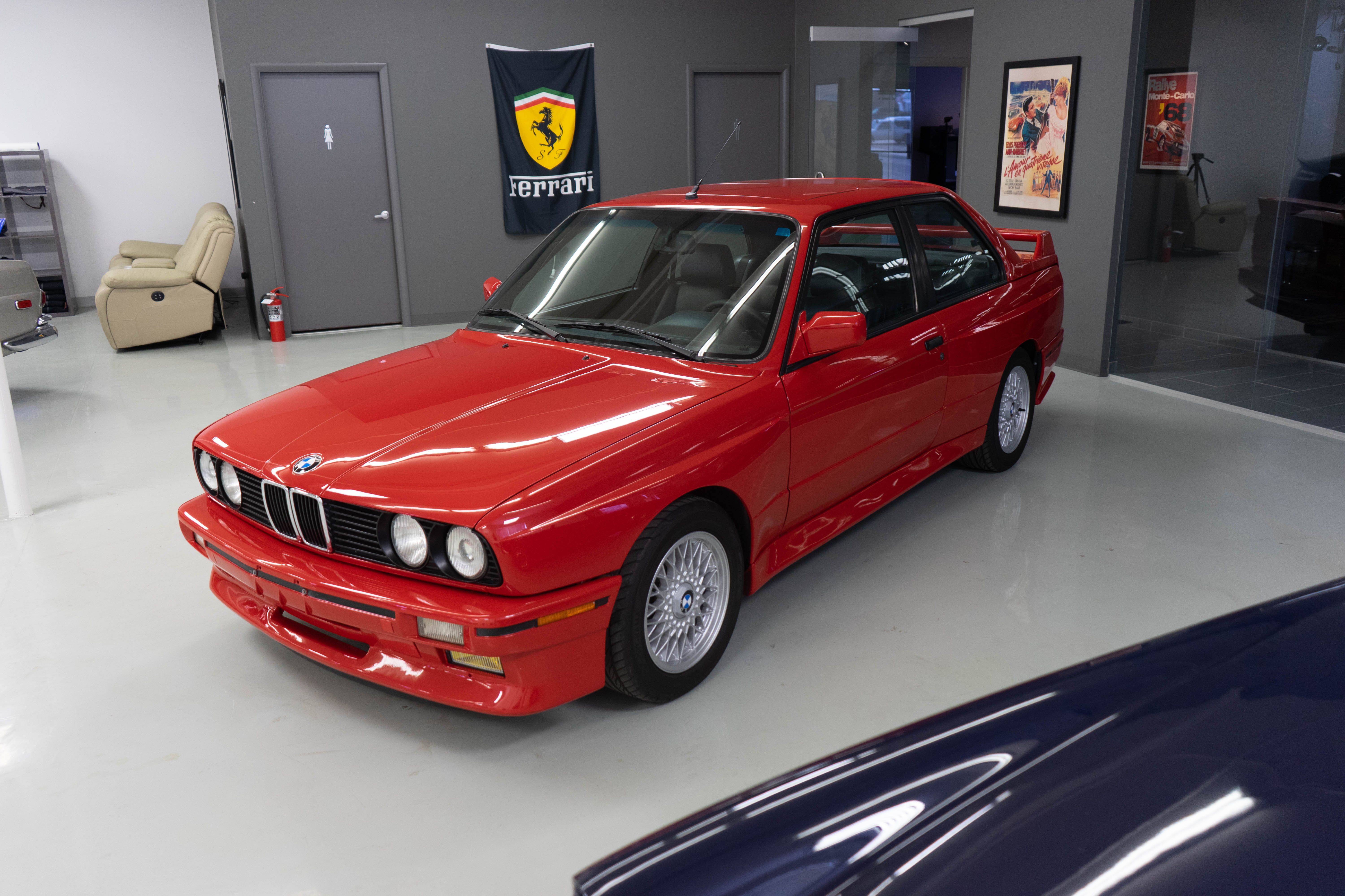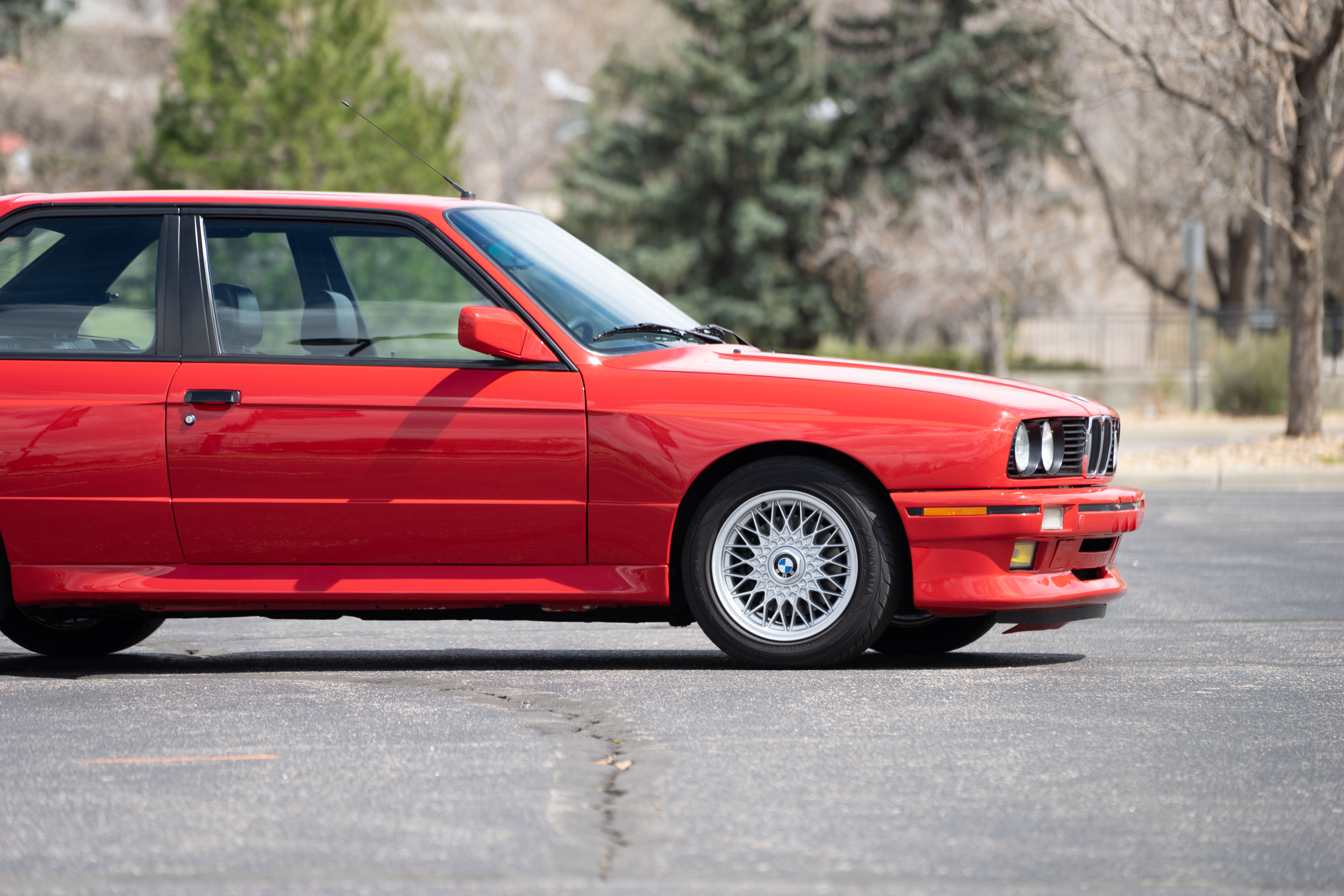 This example is a 1989 E30 M3 finished in Cinnabar Red with a black leather interior. This M3 currently shows just over 108,000 miles on the odometer and is a great ‘drivers’ example. The car has minor bolt-on modifications including a front strut crossmember, an aftermarket cat-back exhaust, and an Alpine radio. The paint is consistent throughout the car and shows minor indications of a previous repaint. Inside, the leather interior is consistent with only minor signs of use.