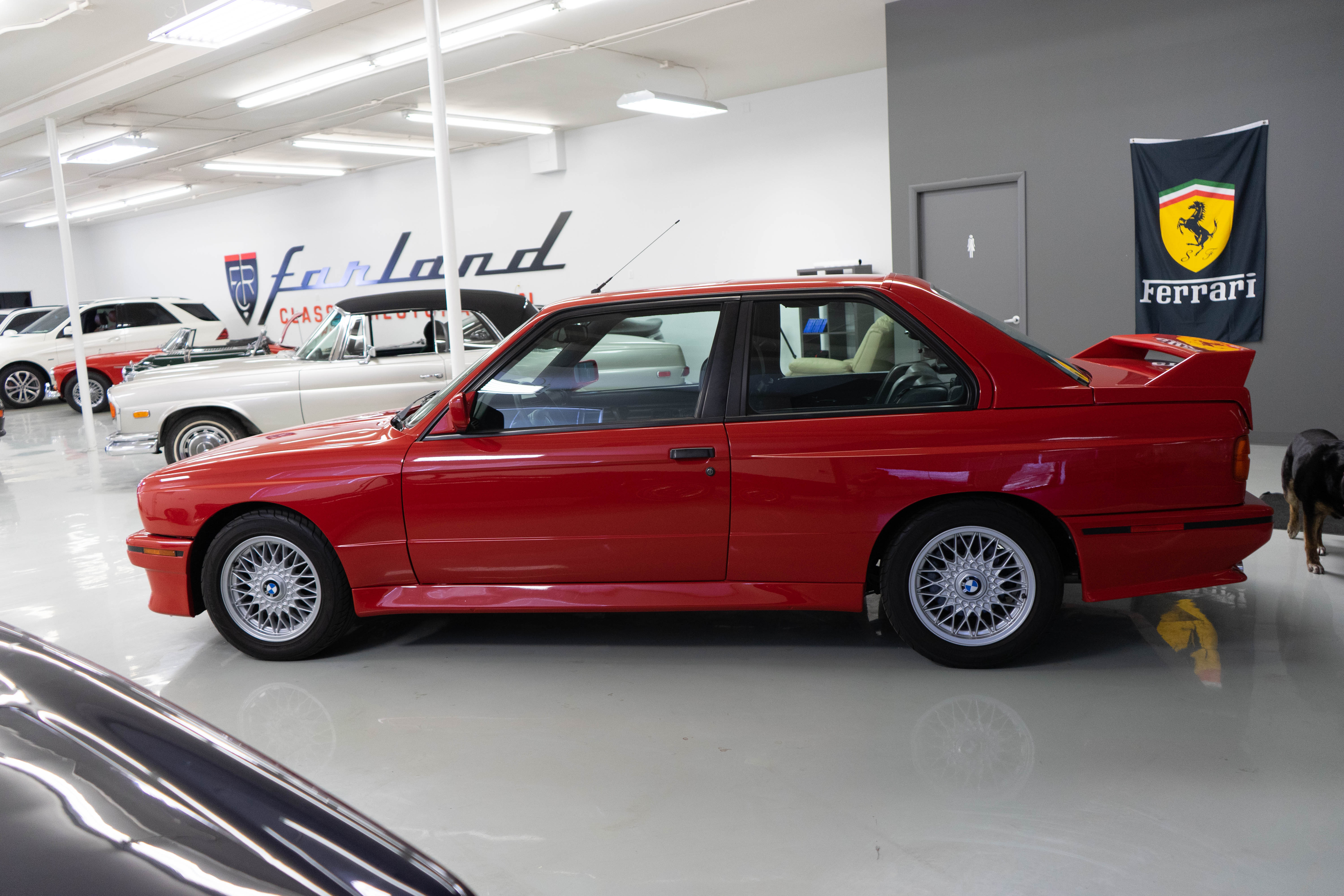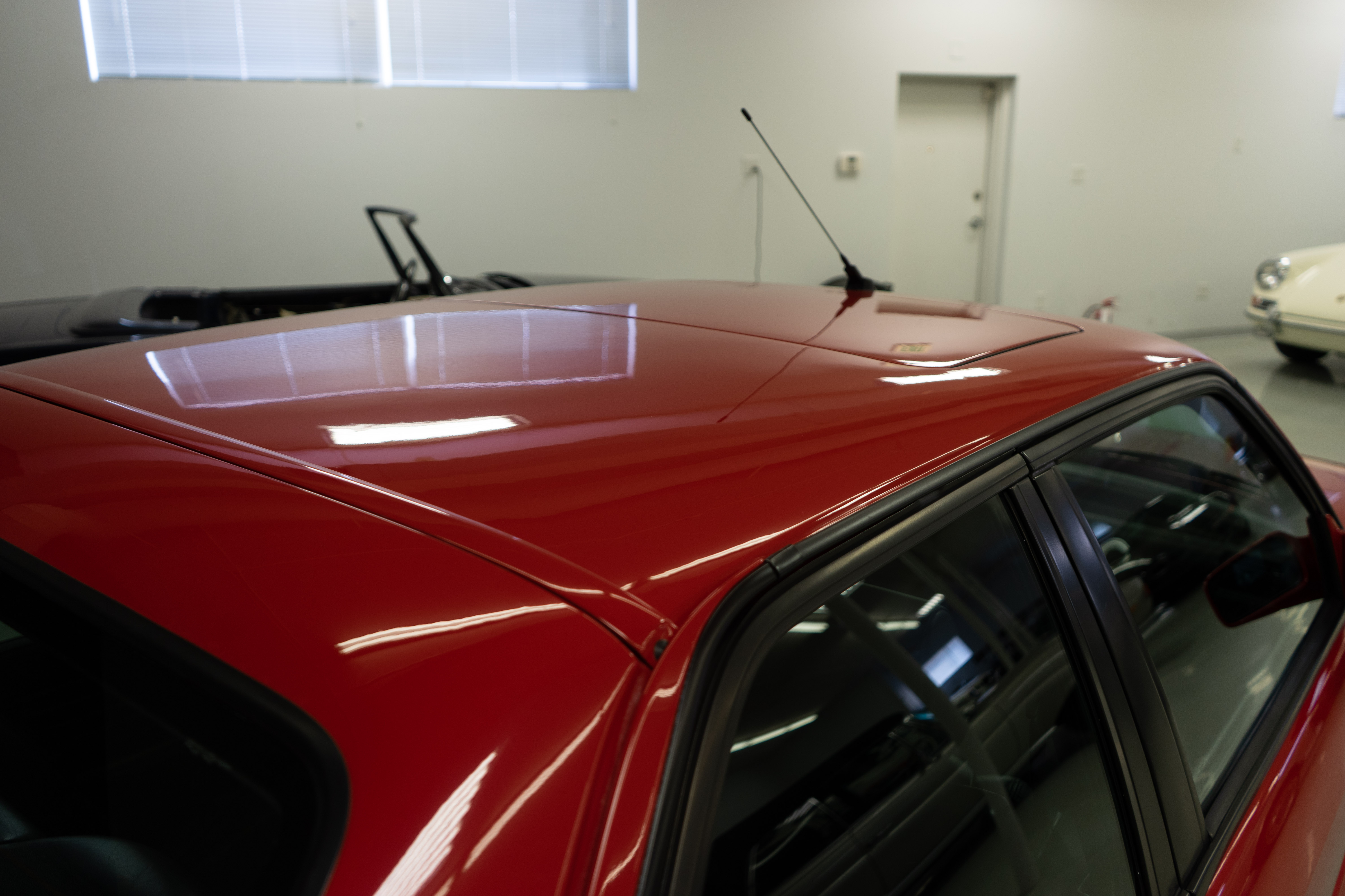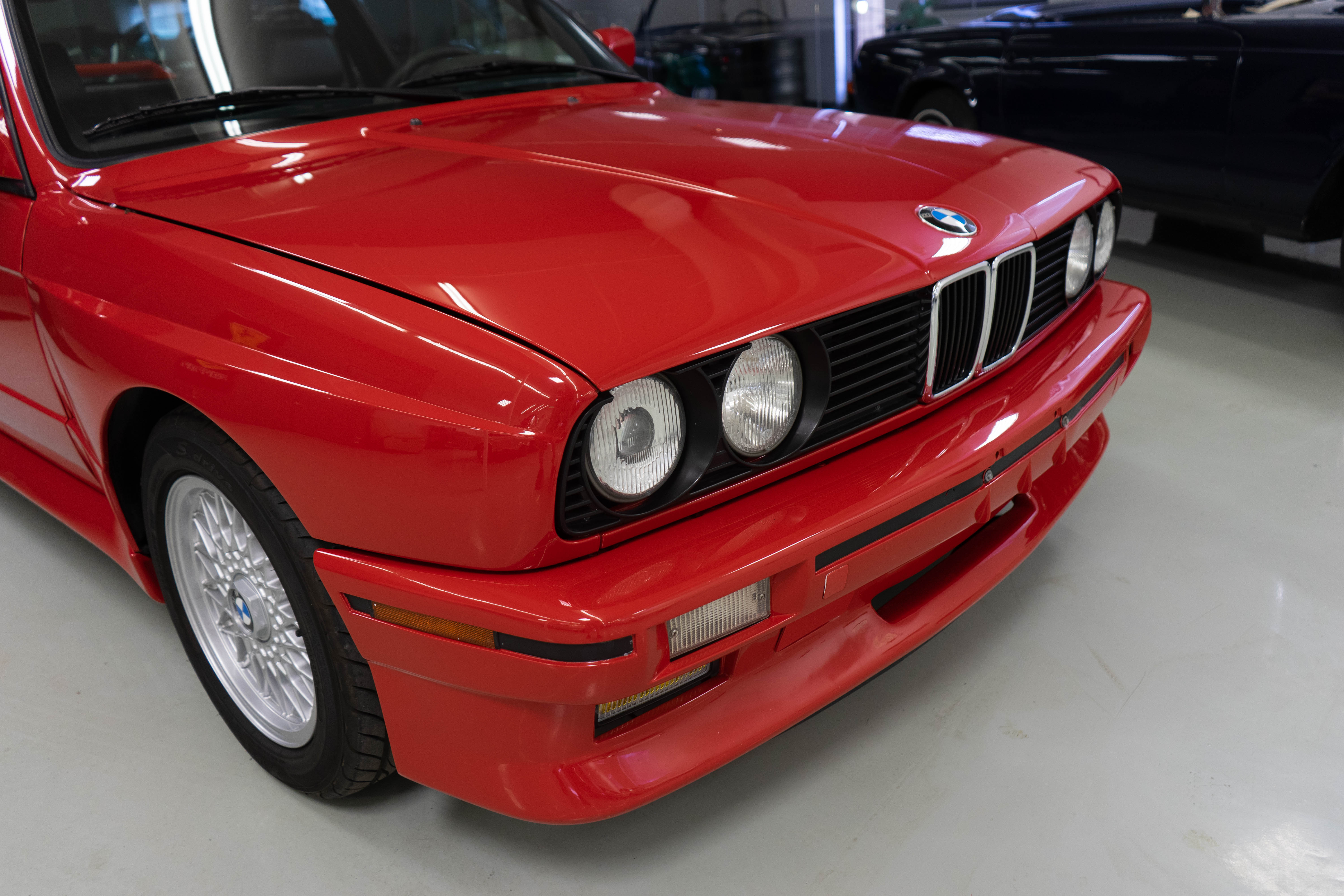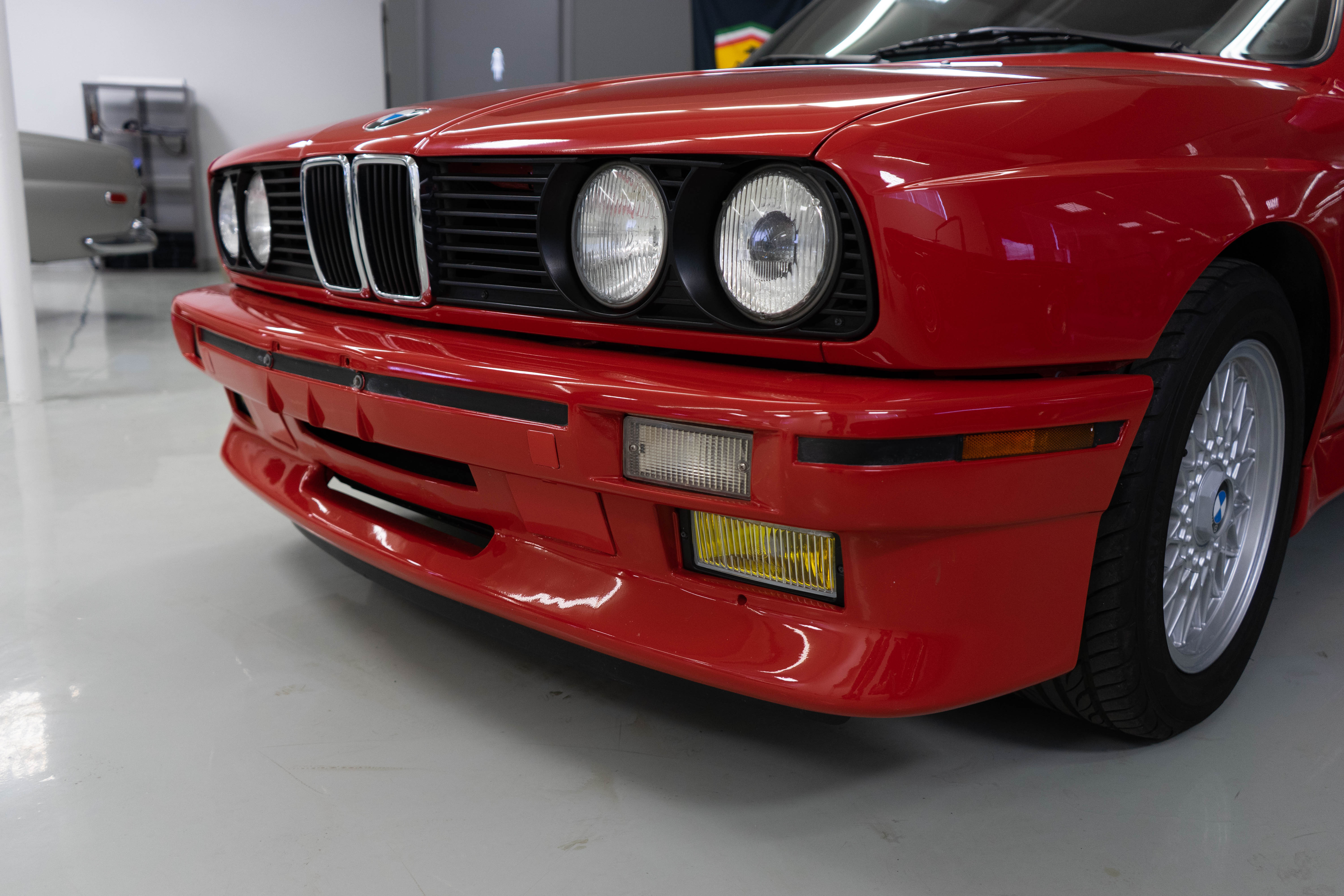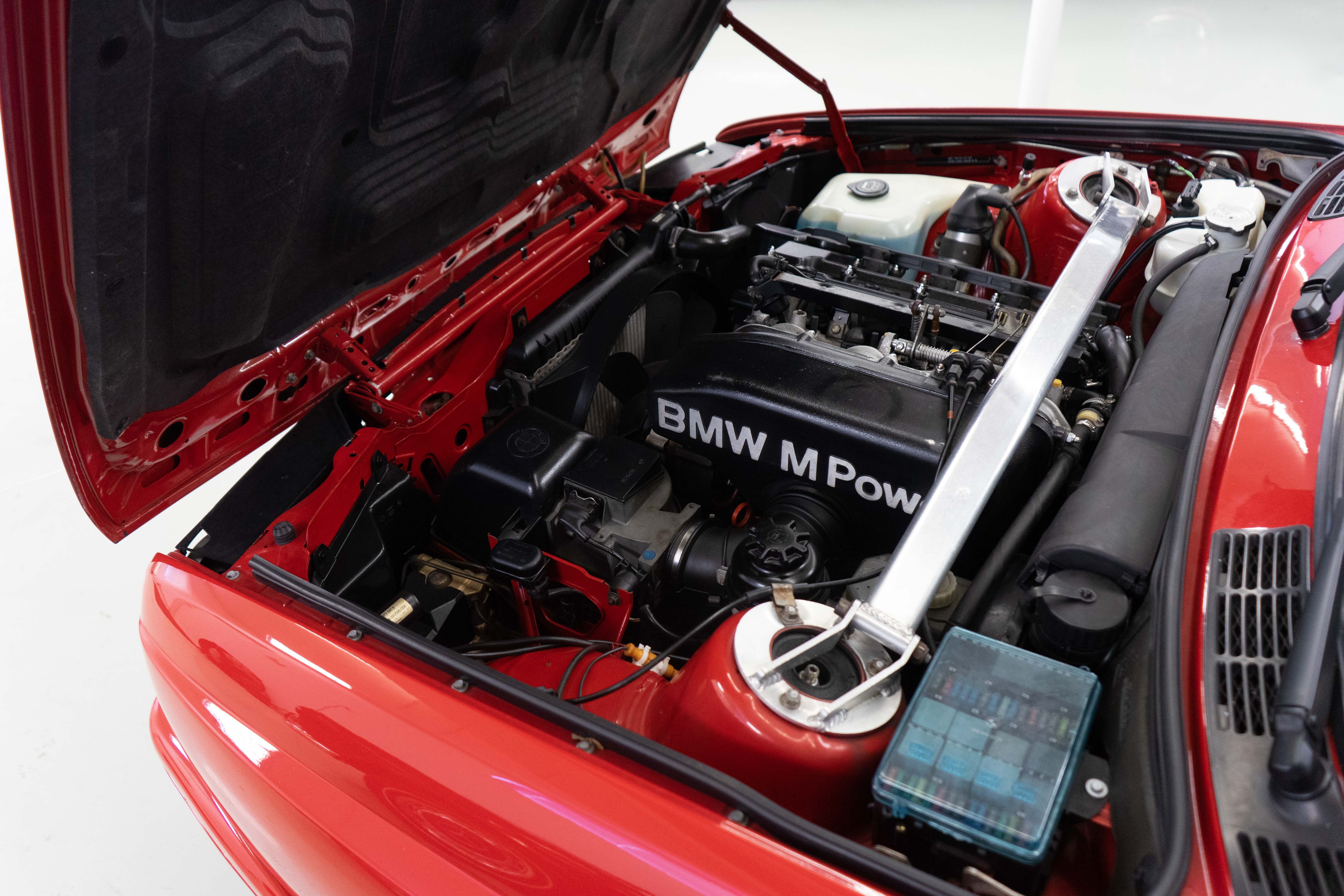 This example is a 1989 E30 M3 finished in Cinnabar Red with a black leather interior. This M3 currently shows just over 108,000 miles on the odometer and is a great ‘drivers’ example. The car has minor bolt-on modifications including a front strut crossmember, an aftermarket cat-back exhaust, and an Alpine radio. The paint is consistent throughout the car and shows minor indications of a previous repaint. Inside, the leather interior is consistent with only minor signs of use.