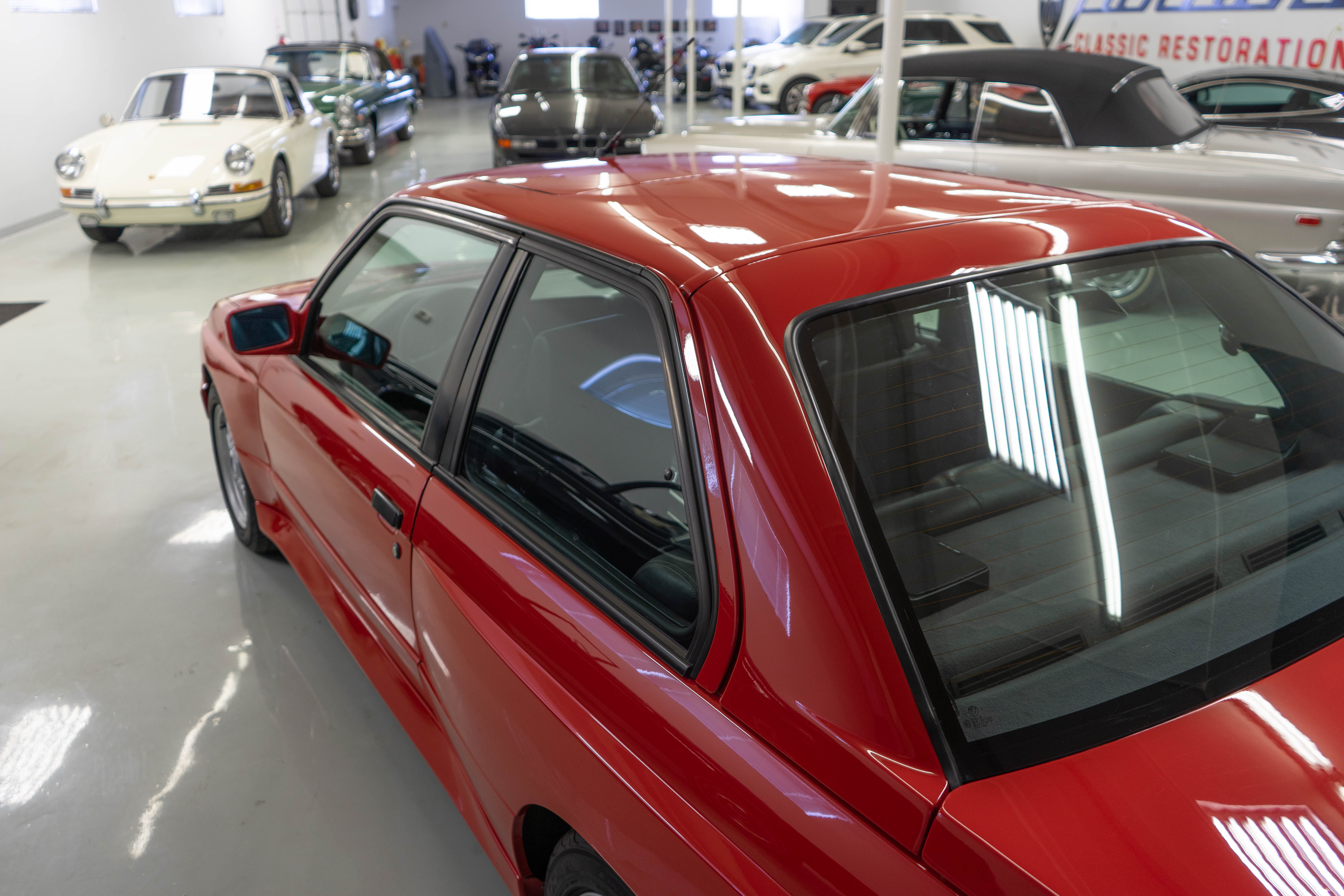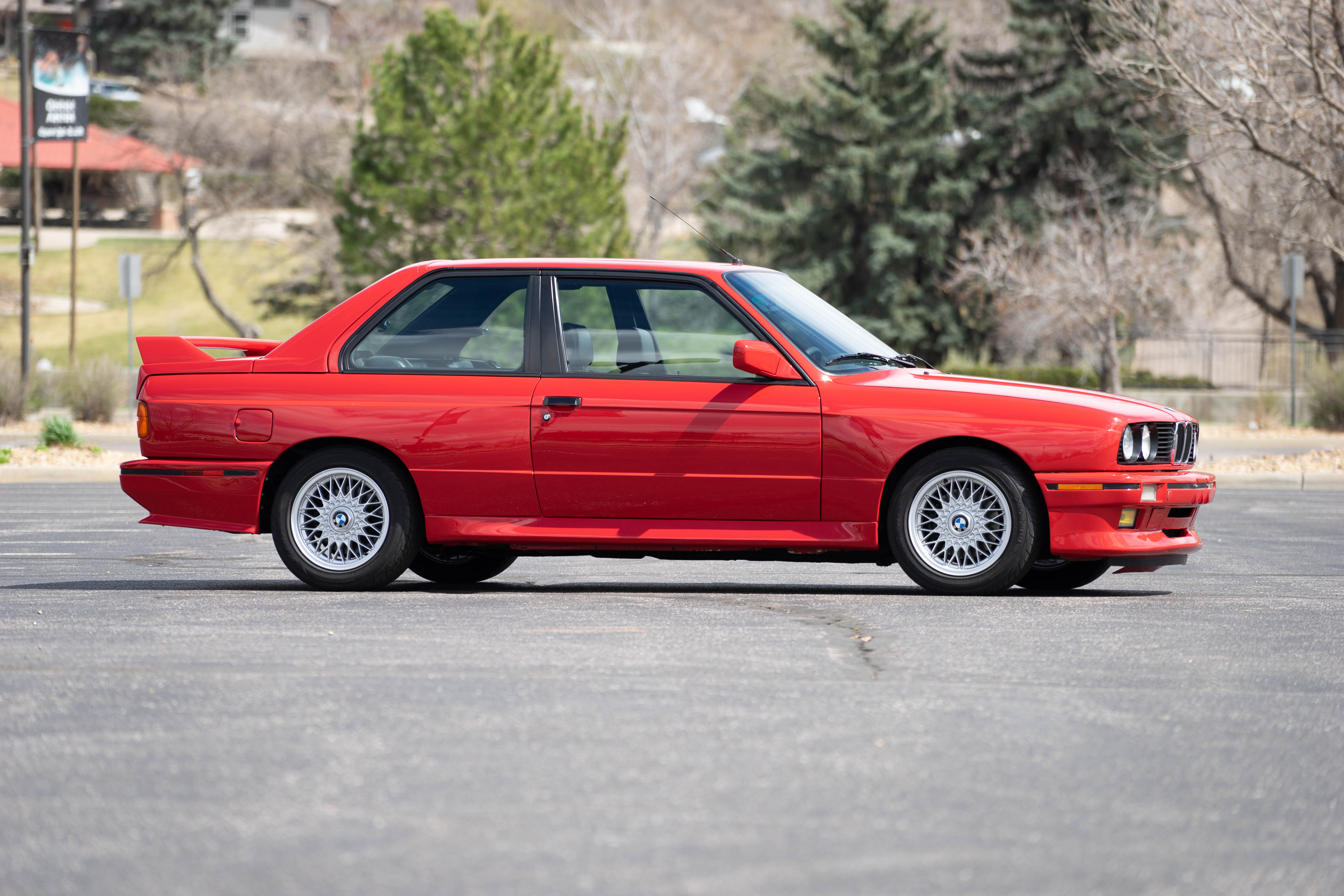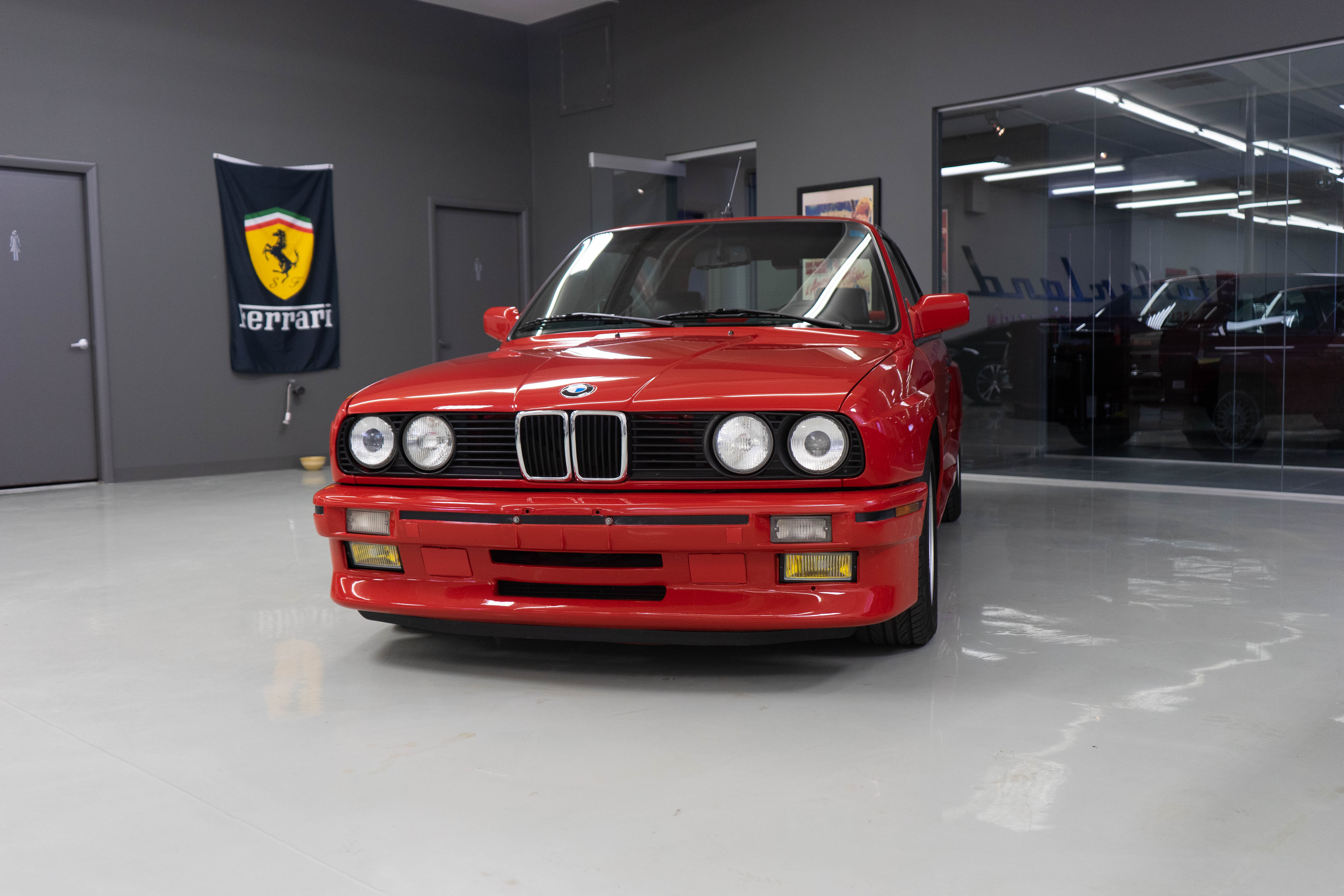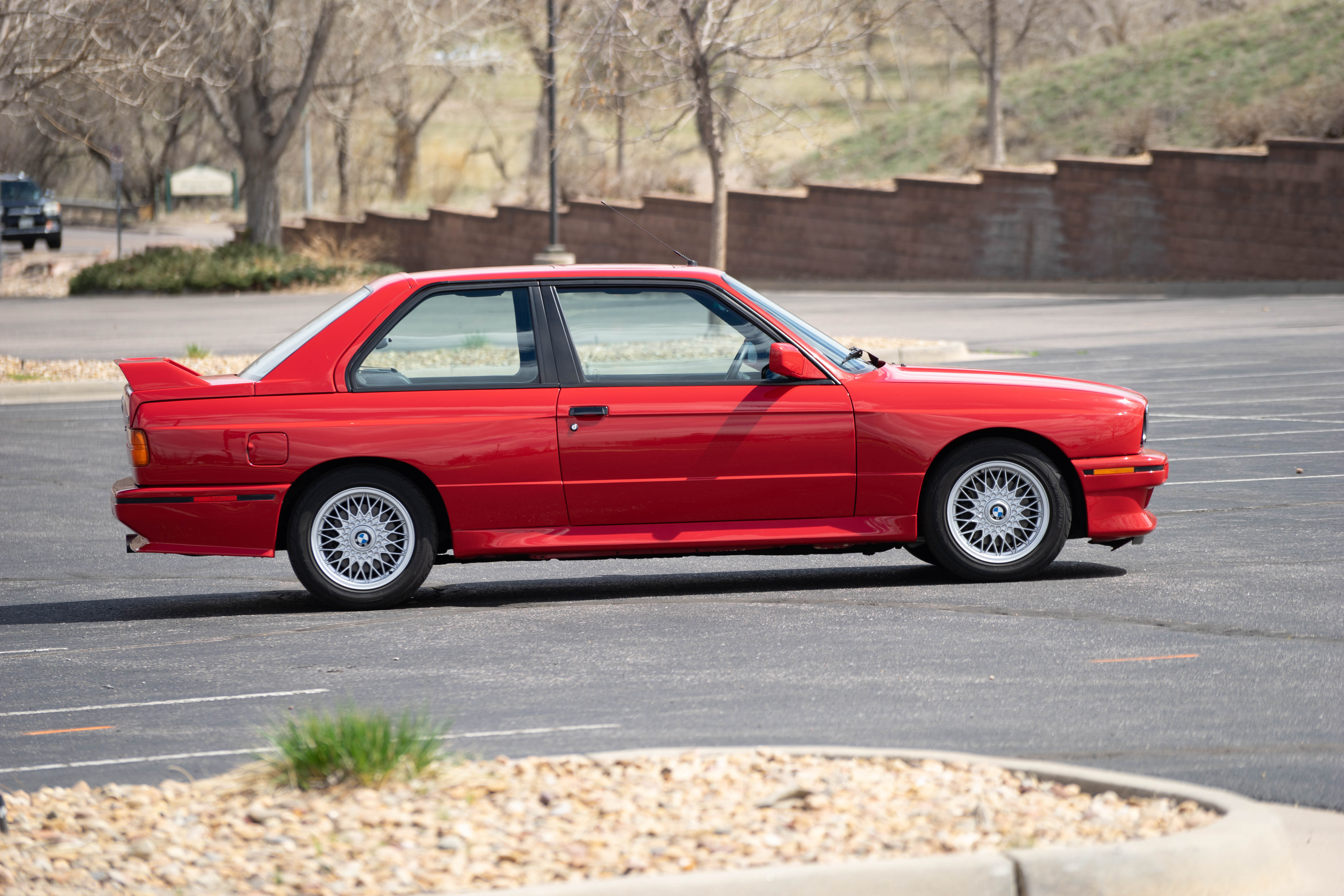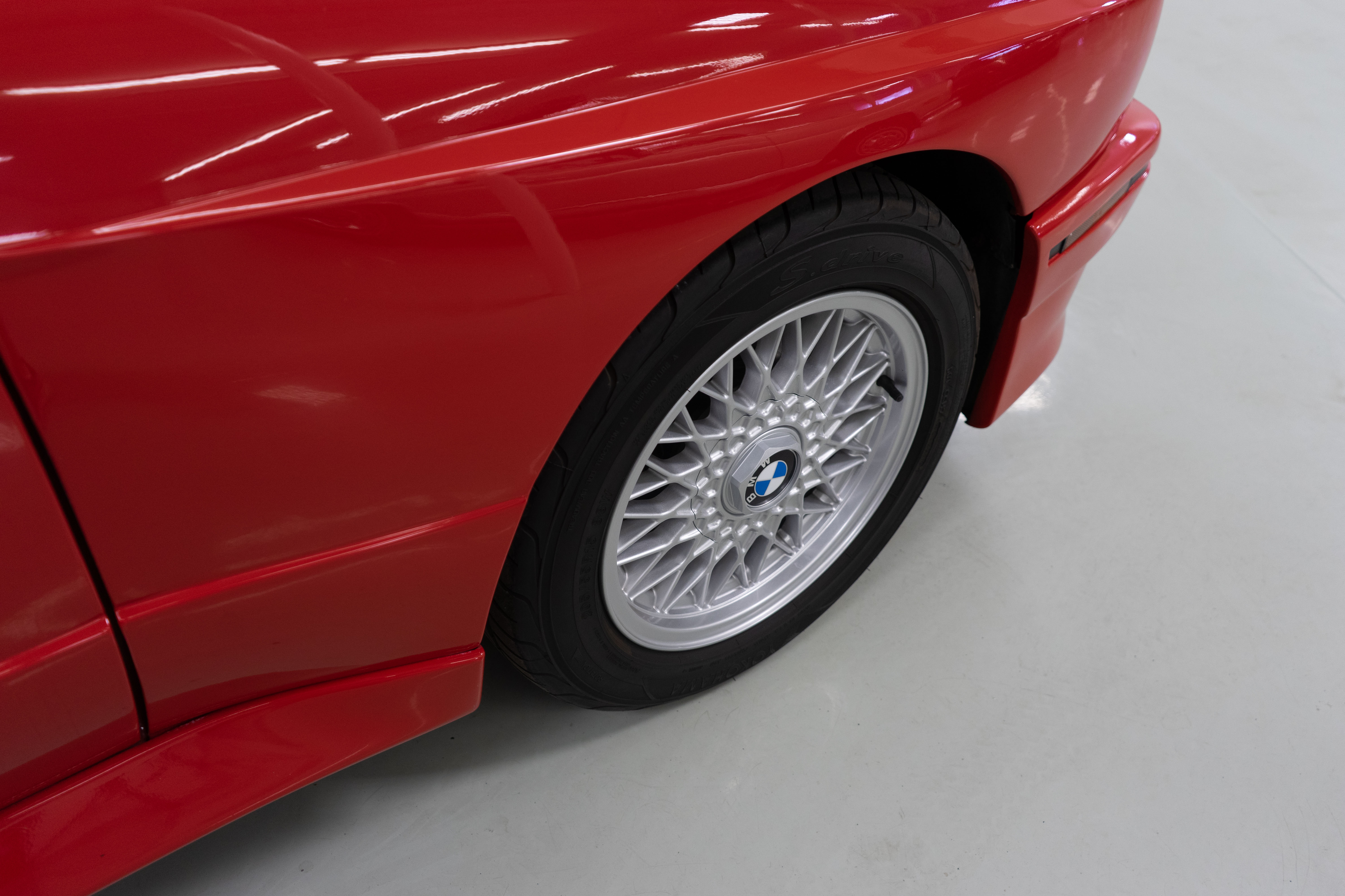 This example is a 1989 E30 M3 finished in Cinnabar Red with a black leather interior. This M3 currently shows just over 108,000 miles on the odometer and is a great ‘drivers’ example. The car has minor bolt-on modifications including a front strut crossmember, an aftermarket cat-back exhaust, and an Alpine radio. The paint is consistent throughout the car and shows minor indications of a previous repaint. Inside, the leather interior is consistent with only minor signs of use.