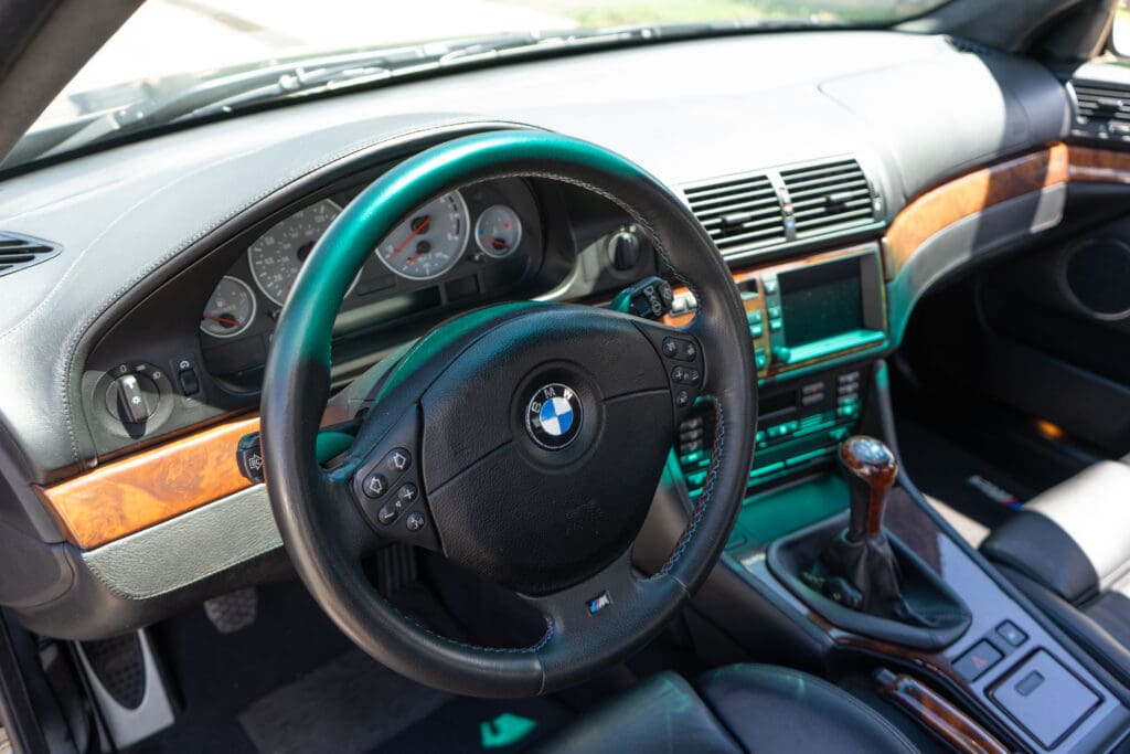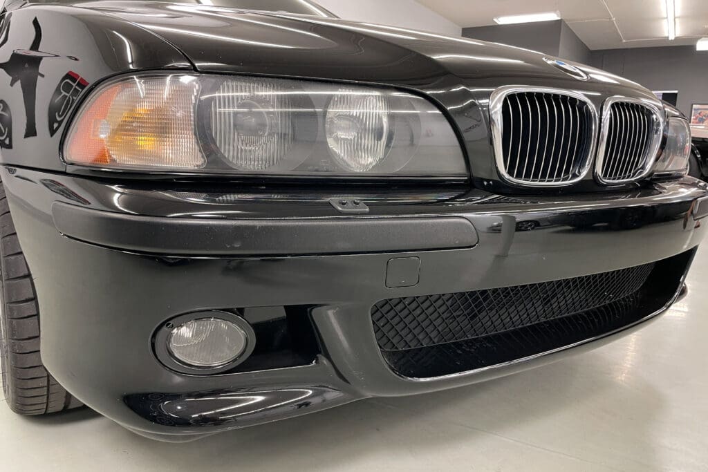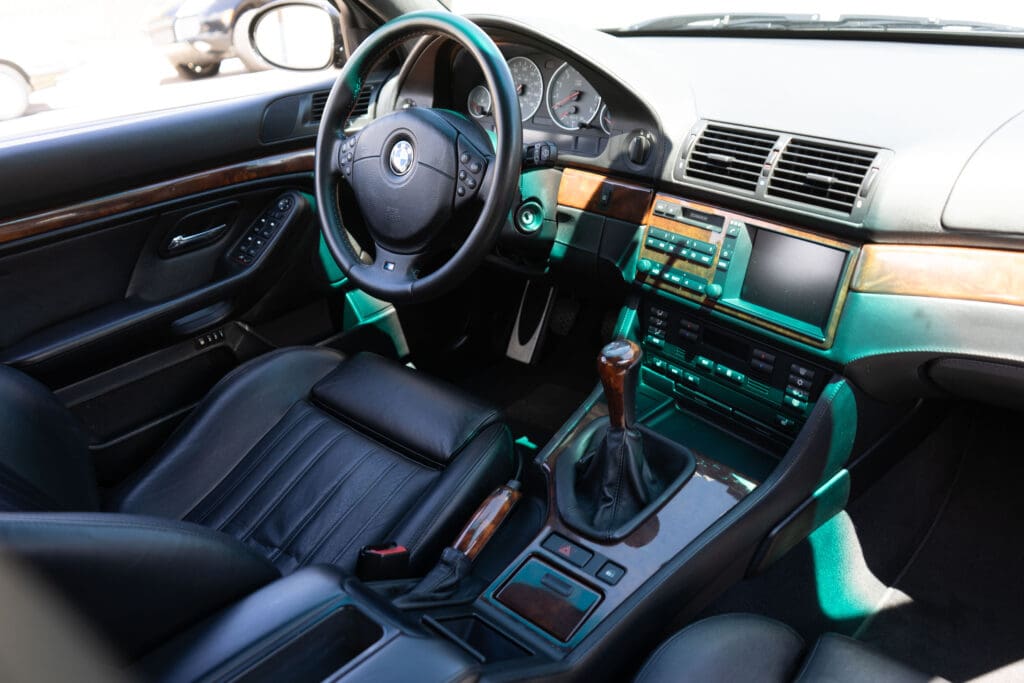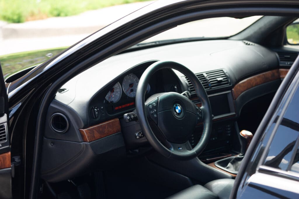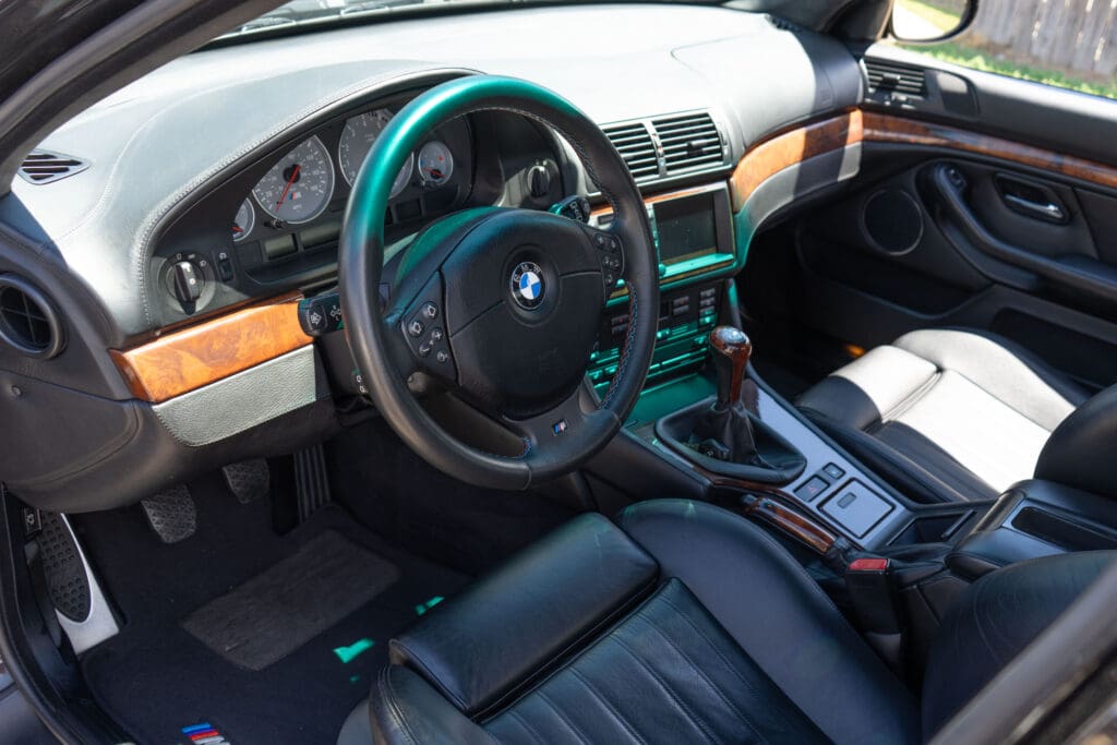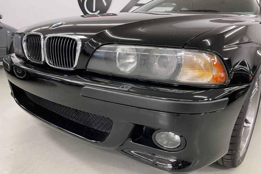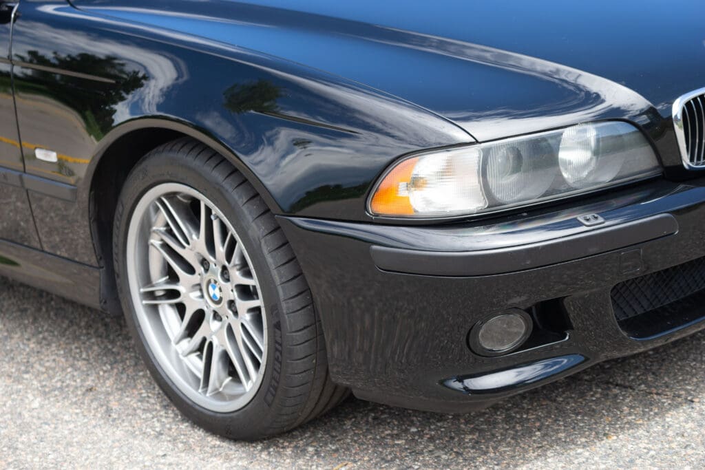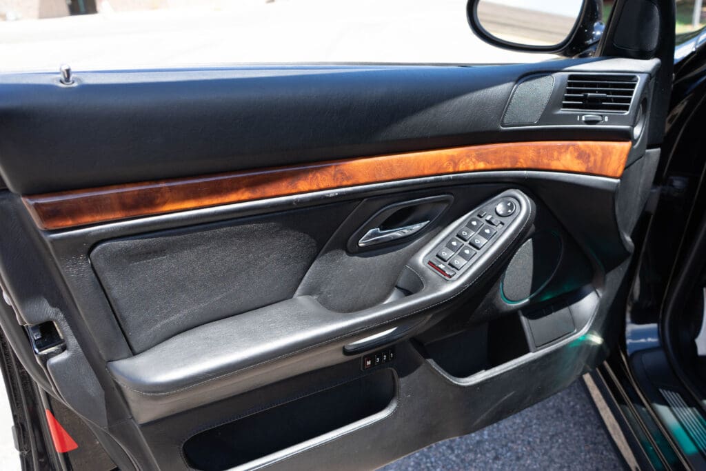 The E39 BMW M5 is one of the great European Autobahn blazers. This example, in Black II over Black interior is in excellent condition. Showing just over 85,000 miles, the interior and exterior have held up beautifully. Our shop just did a complete detail, so it’s looking its best. The 5-liter, 32 valve V8 DOHC engine brings 394hp and simply rips. The complete leather interior is in terrific shape and the exterior body and paint are excellent as well. Some chips appear along the front of the hood and bumper, and the headlight plastic covers are very, very slightly hazed. Wheels are all in very good shape. Some very light scuffs appear on a couple of them.