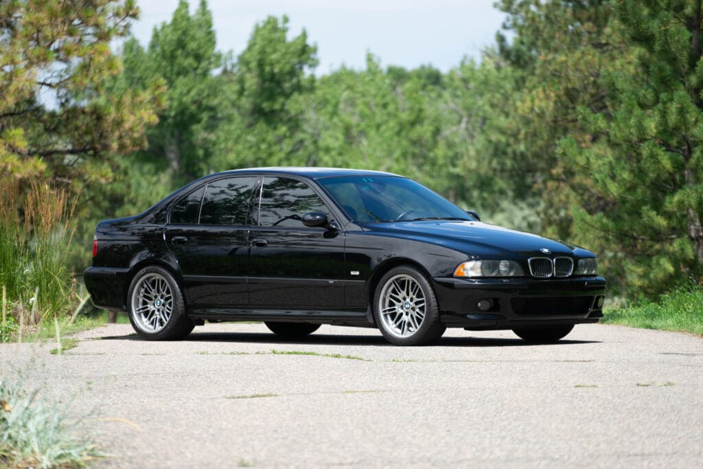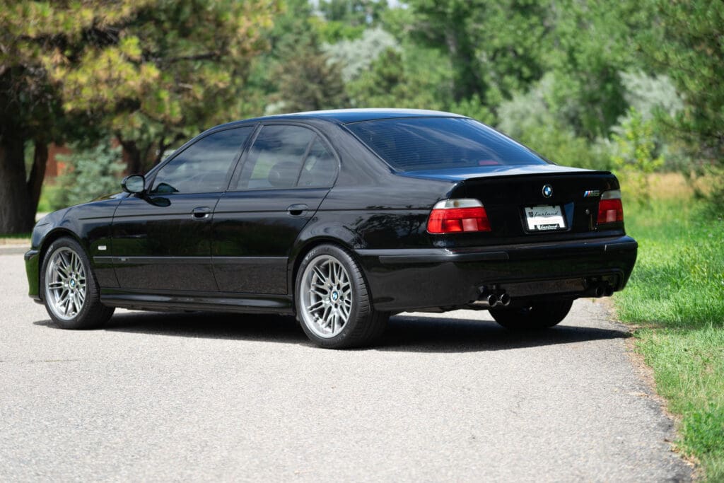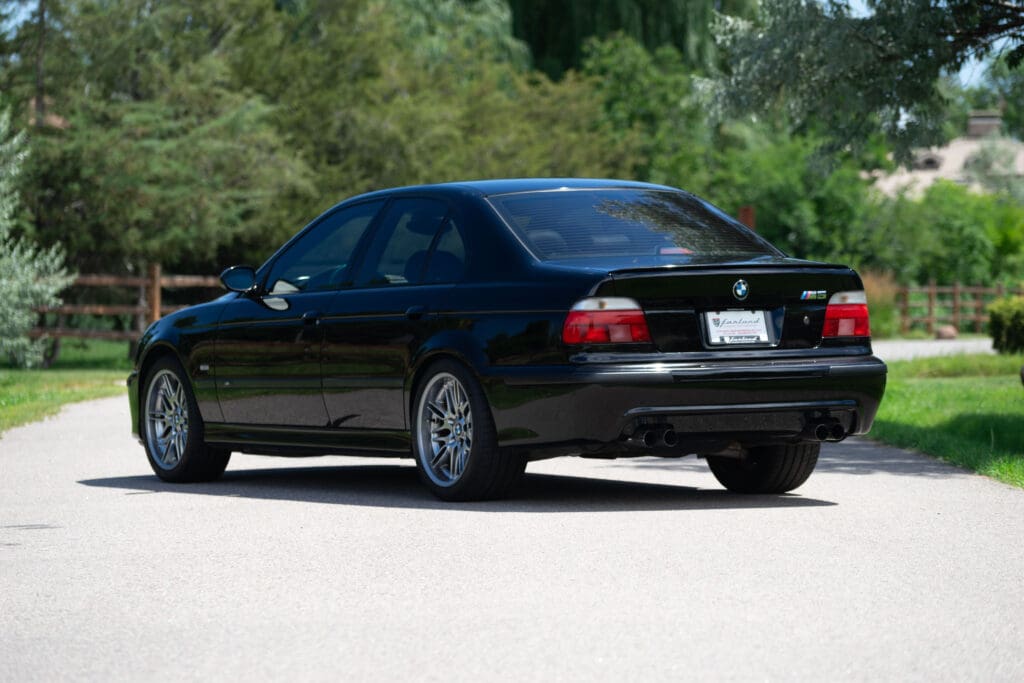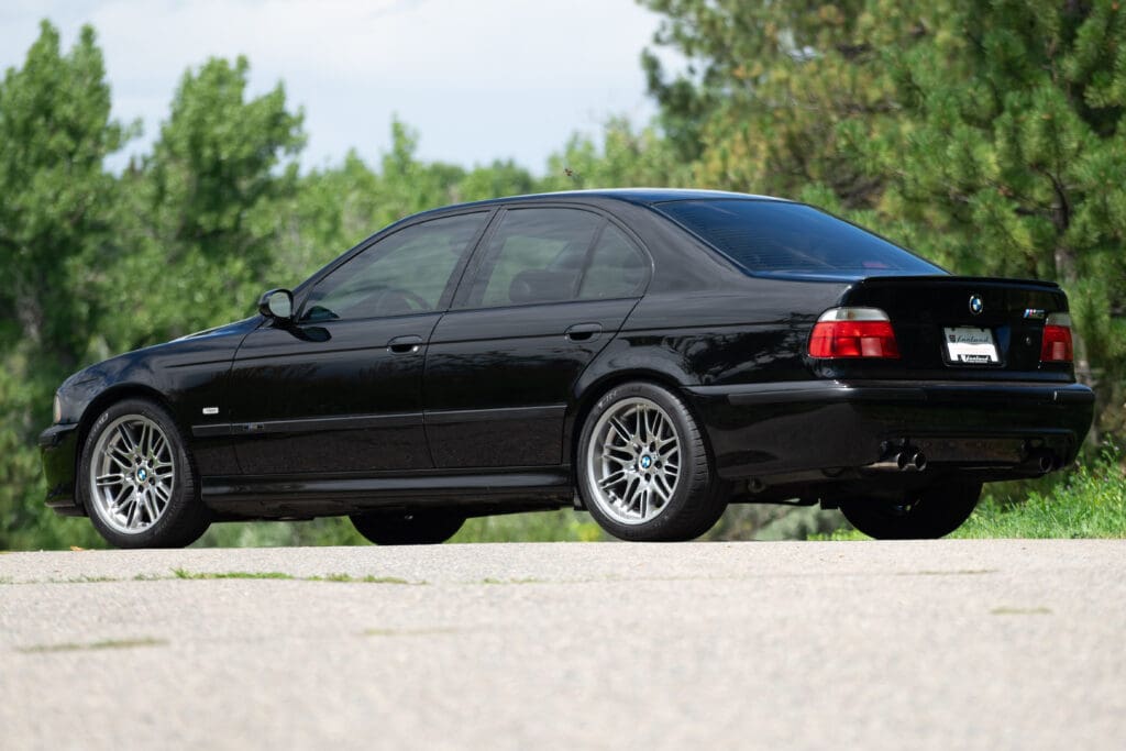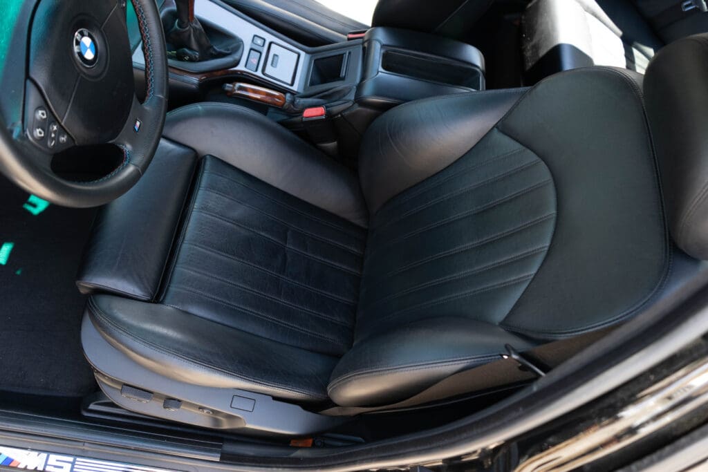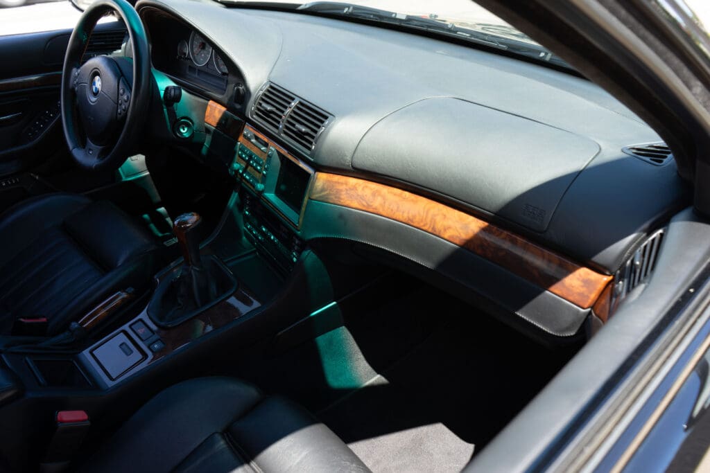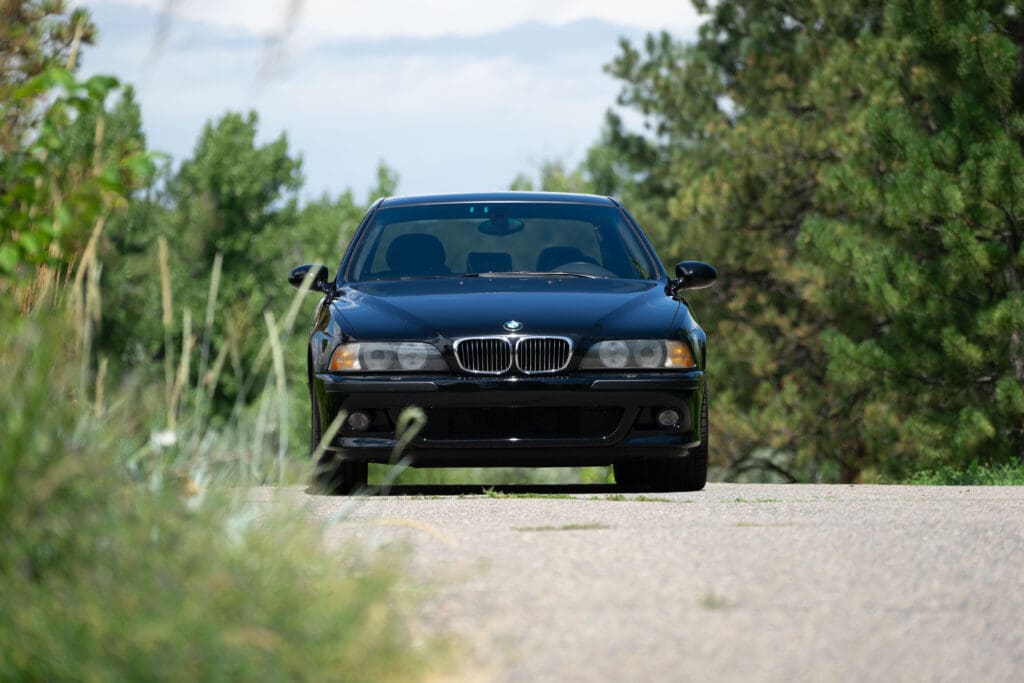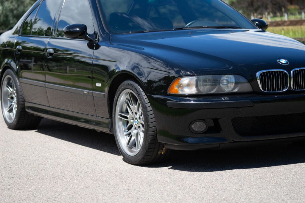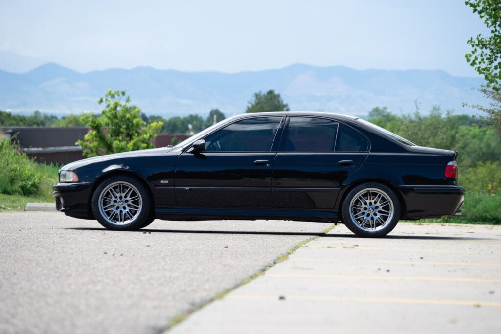 The E39 BMW M5 is one of the great European Autobahn blazers. This example, in Black II over Black interior is in excellent condition. Showing just over 85,000 miles, the interior and exterior have held up beautifully. Our shop just did a complete detail, so it’s looking its best. The 5-liter, 32 valve V8 DOHC engine brings 394hp and simply rips. The complete leather interior is in terrific shape and the exterior body and paint are excellent as well. Some chips appear along the front of the hood and bumper, and the headlight plastic covers are very, very slightly hazed. Wheels are all in very good shape. Some very light scuffs appear on a couple of them.