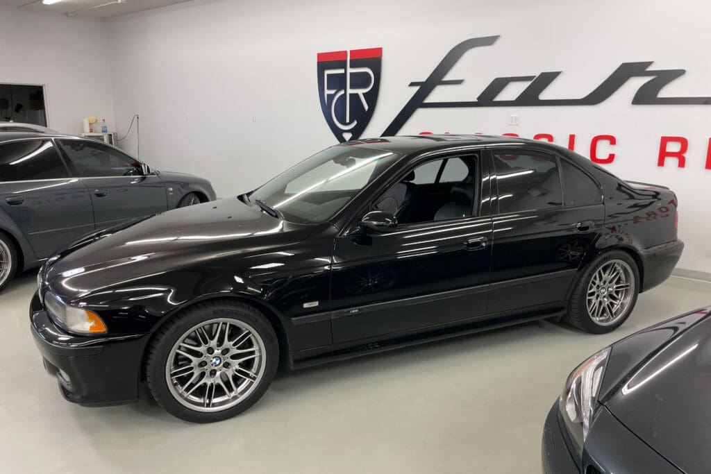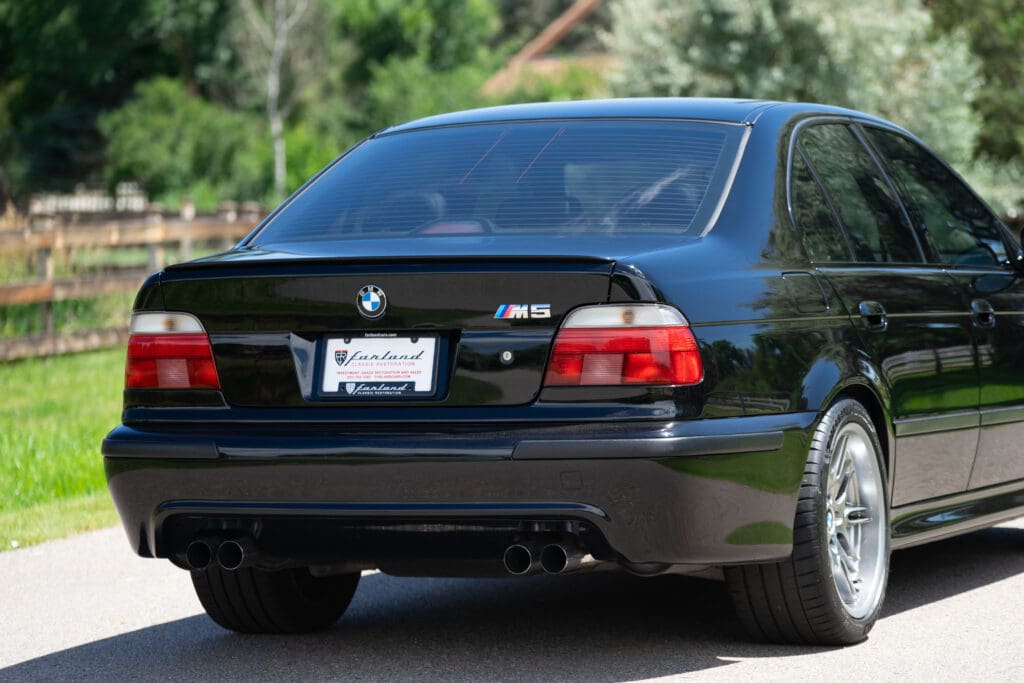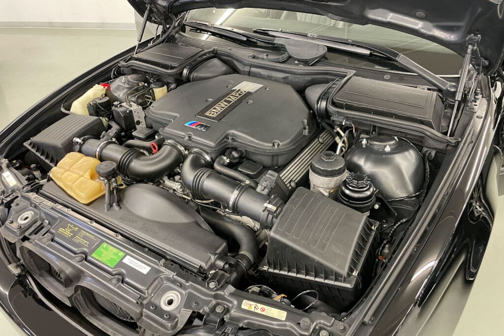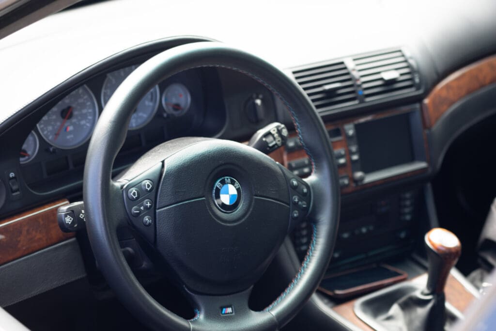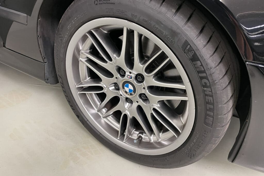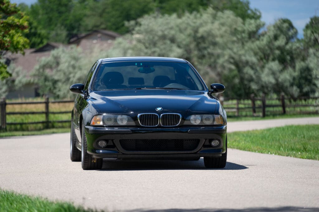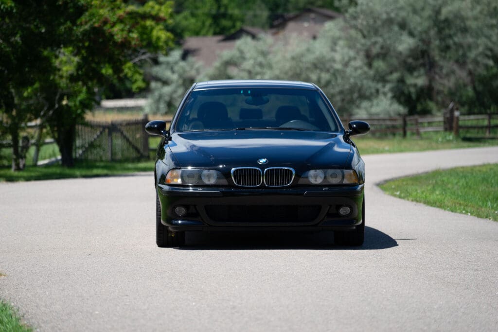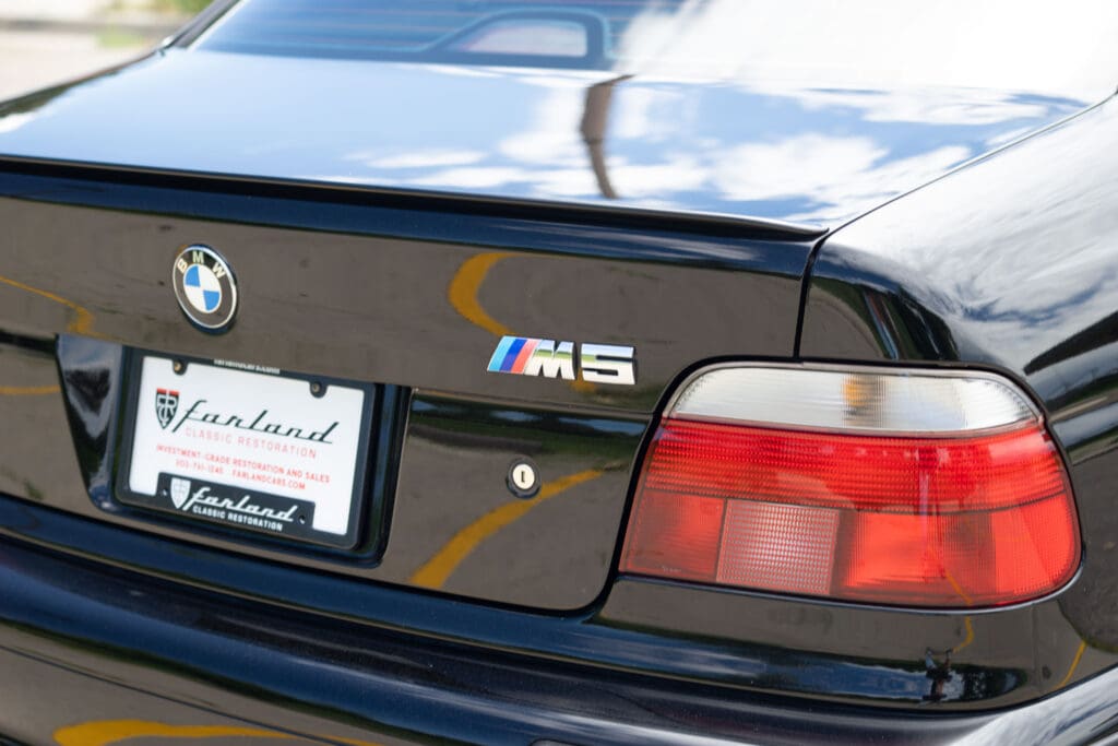 The E39 BMW M5 is one of the great European Autobahn blazers. This example, in Black II over Black interior is in excellent condition. Showing just over 85,000 miles, the interior and exterior have held up beautifully. Our shop just did a complete detail, so it’s looking its best. The 5-liter, 32 valve V8 DOHC engine brings 394hp and simply rips. The complete leather interior is in terrific shape and the exterior body and paint are excellent as well. Some chips appear along the front of the hood and bumper, and the headlight plastic covers are very, very slightly hazed. Wheels are all in very good shape. Some very light scuffs appear on a couple of them.