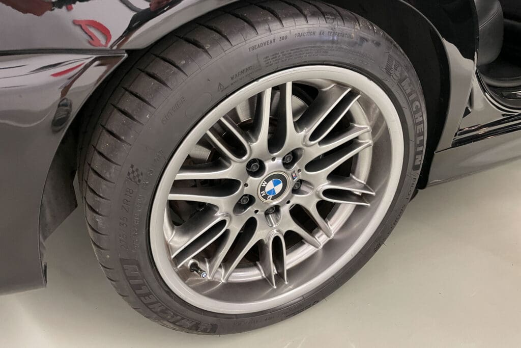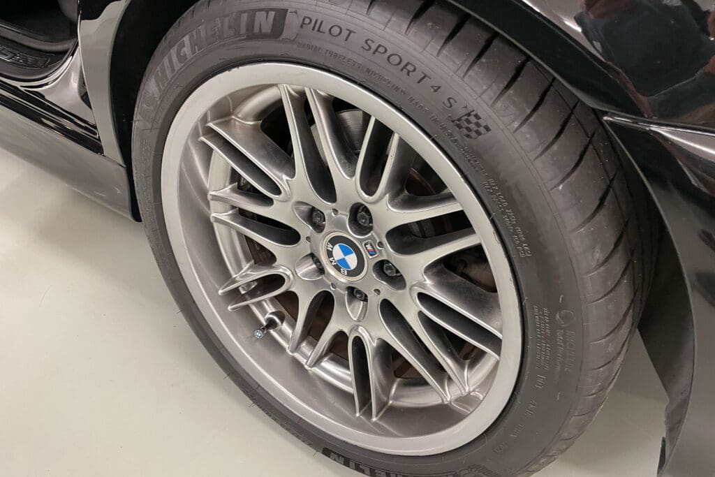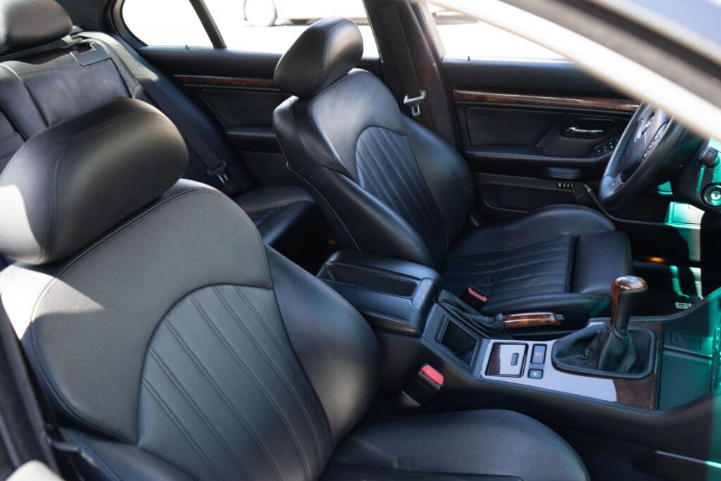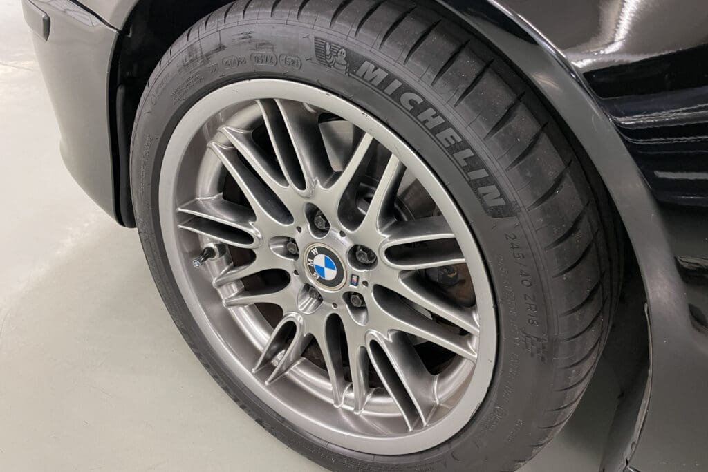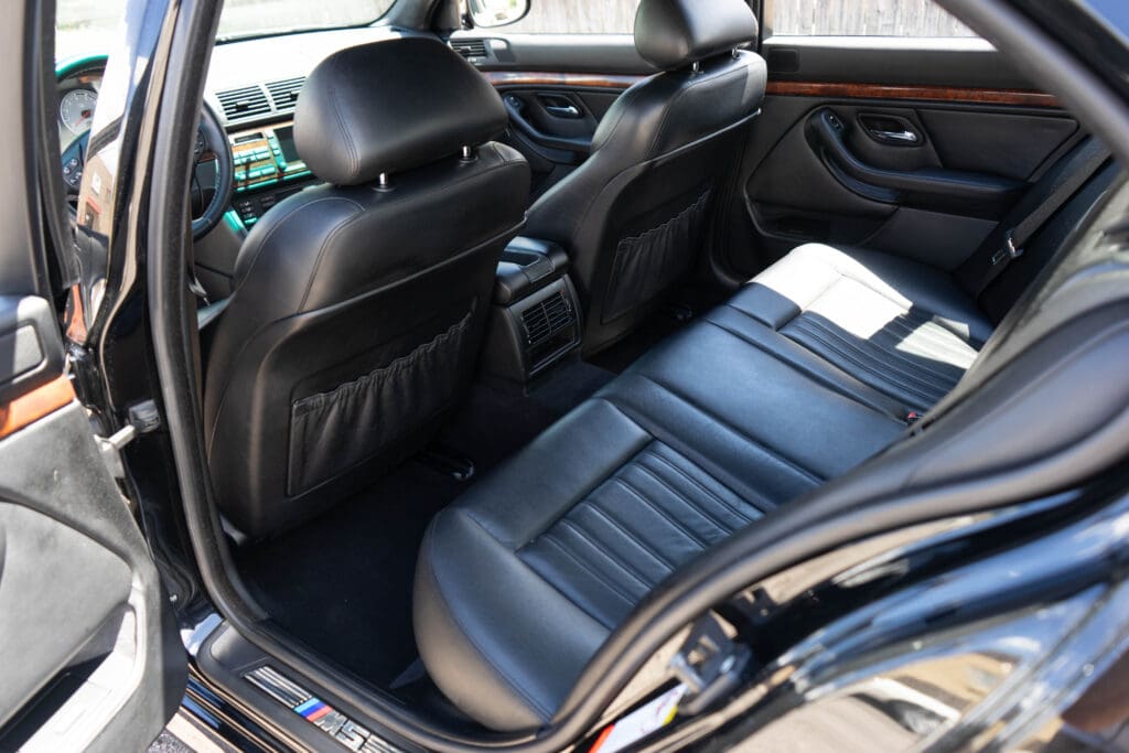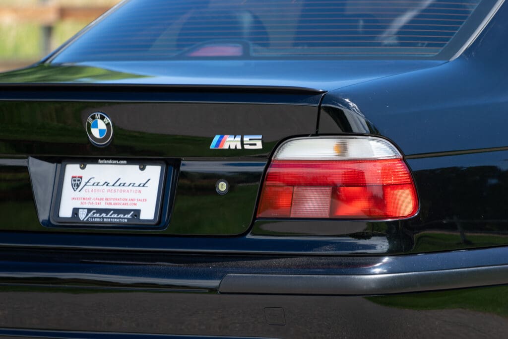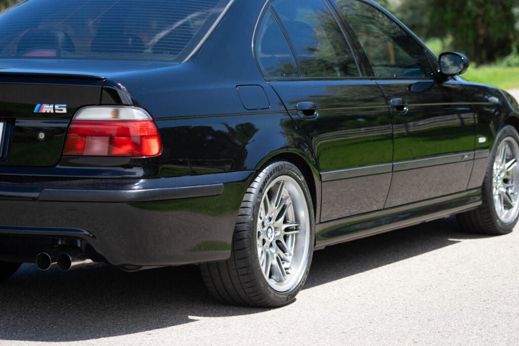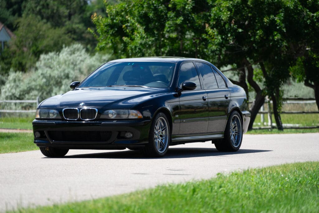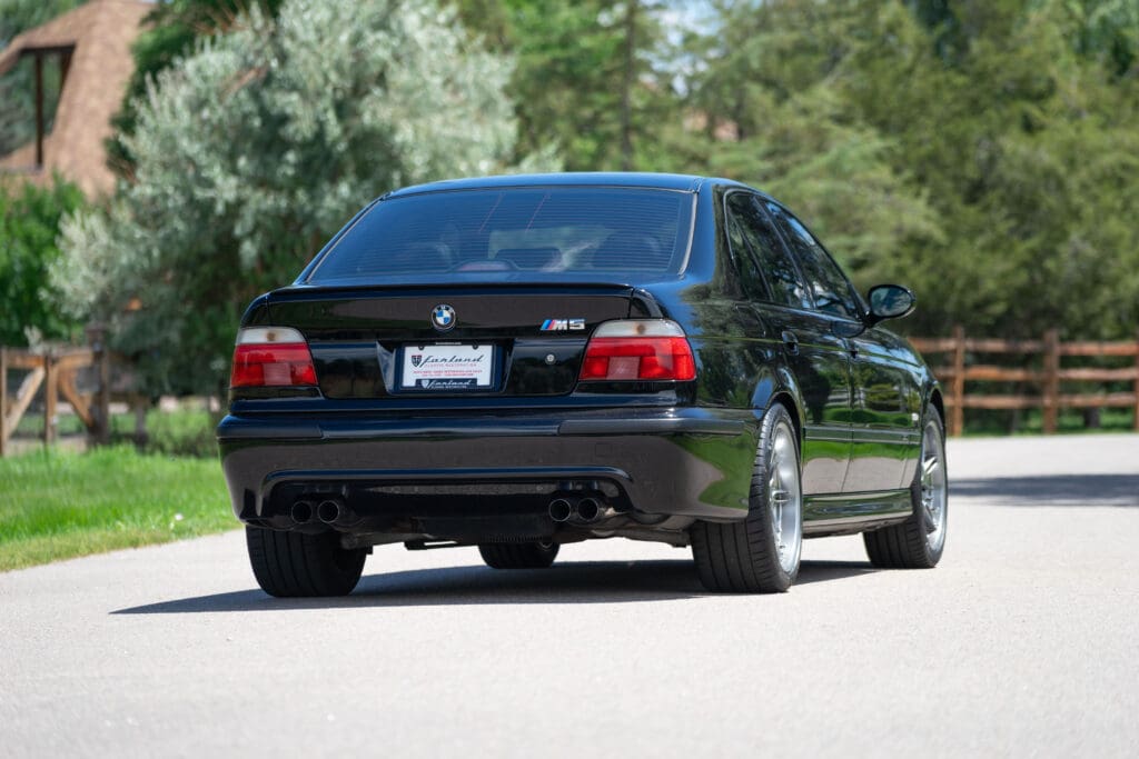 The E39 BMW M5 is one of the great European Autobahn blazers. This example, in Black II over Black interior is in excellent condition. Showing just over 85,000 miles, the interior and exterior have held up beautifully. Our shop just did a complete detail, so it’s looking its best. The 5-liter, 32 valve V8 DOHC engine brings 394hp and simply rips. The complete leather interior is in terrific shape and the exterior body and paint are excellent as well. Some chips appear along the front of the hood and bumper, and the headlight plastic covers are very, very slightly hazed. Wheels are all in very good shape. Some very light scuffs appear on a couple of them.