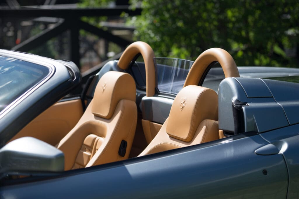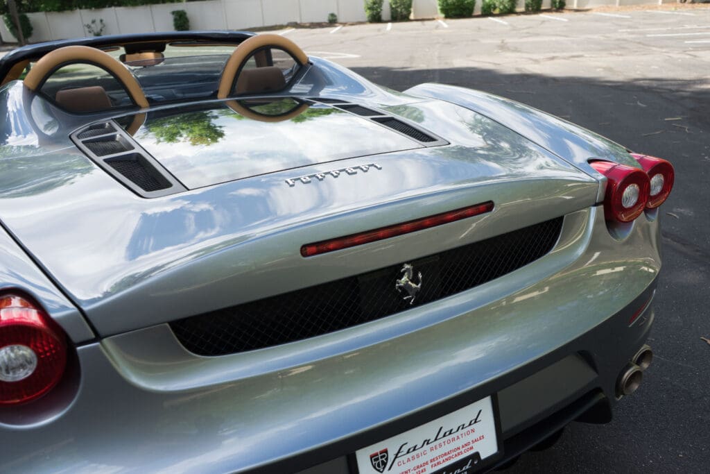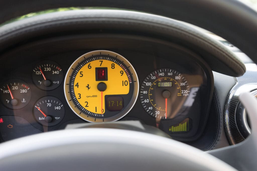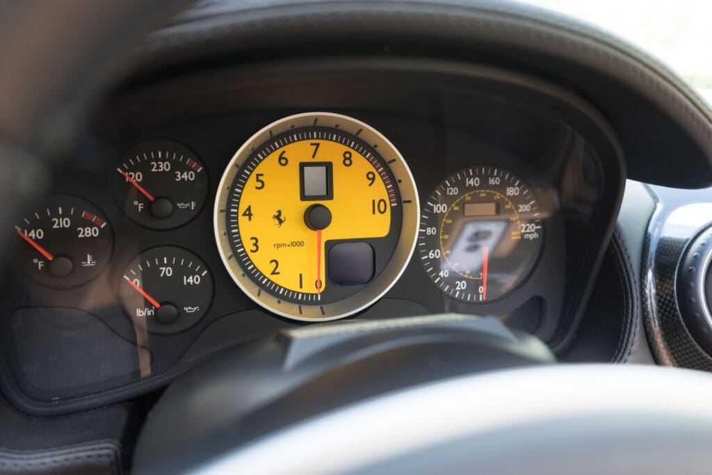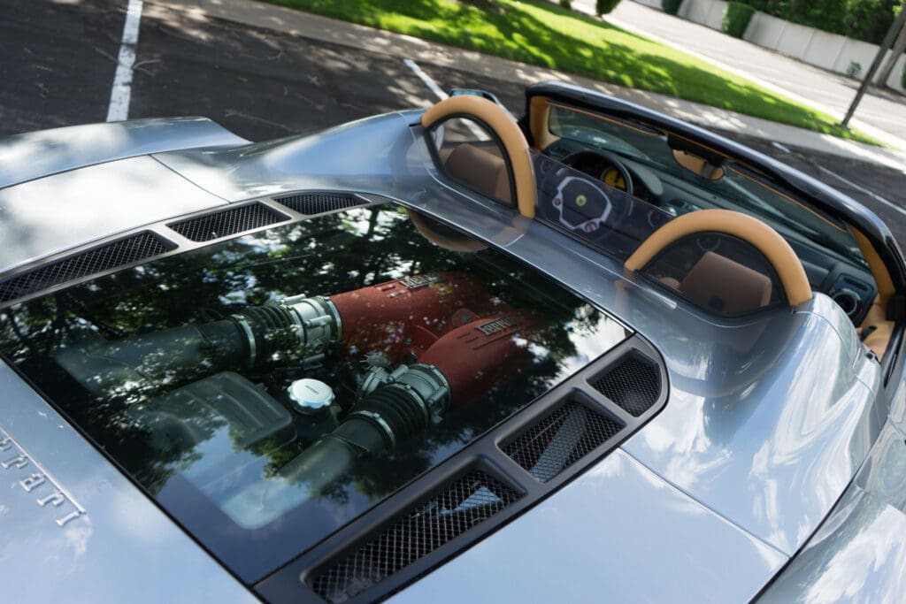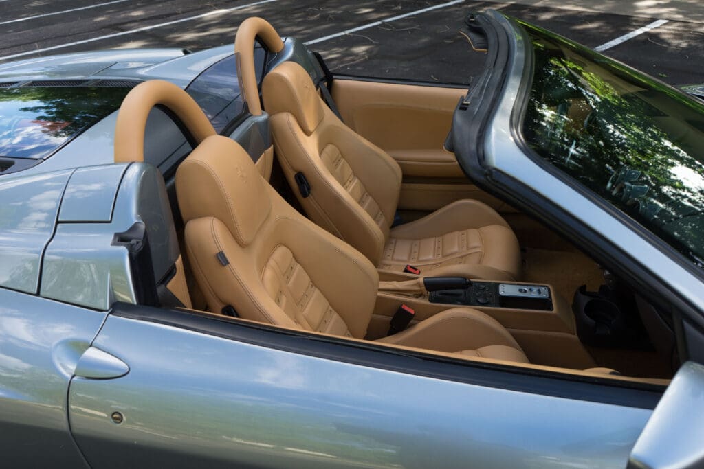 The interior was trimmed with the yellow tach face and carbon-fiber dash choices. The original tool sets are still wrapped in plastic in the trunk, and the leather pouch of owner’s and warranty books and radio codes is complete—plus both electronic keys. A quality car cover and battery maintainer are also included. Absolutely no shrinkage on the dash leather, interior is spotless.This Spider has had recent Ferrari dealer servicing and the exterior has been given a professionally-applied ceramic coating a year ago, plus ClearBra on the front panels, mirrors and rear splash.