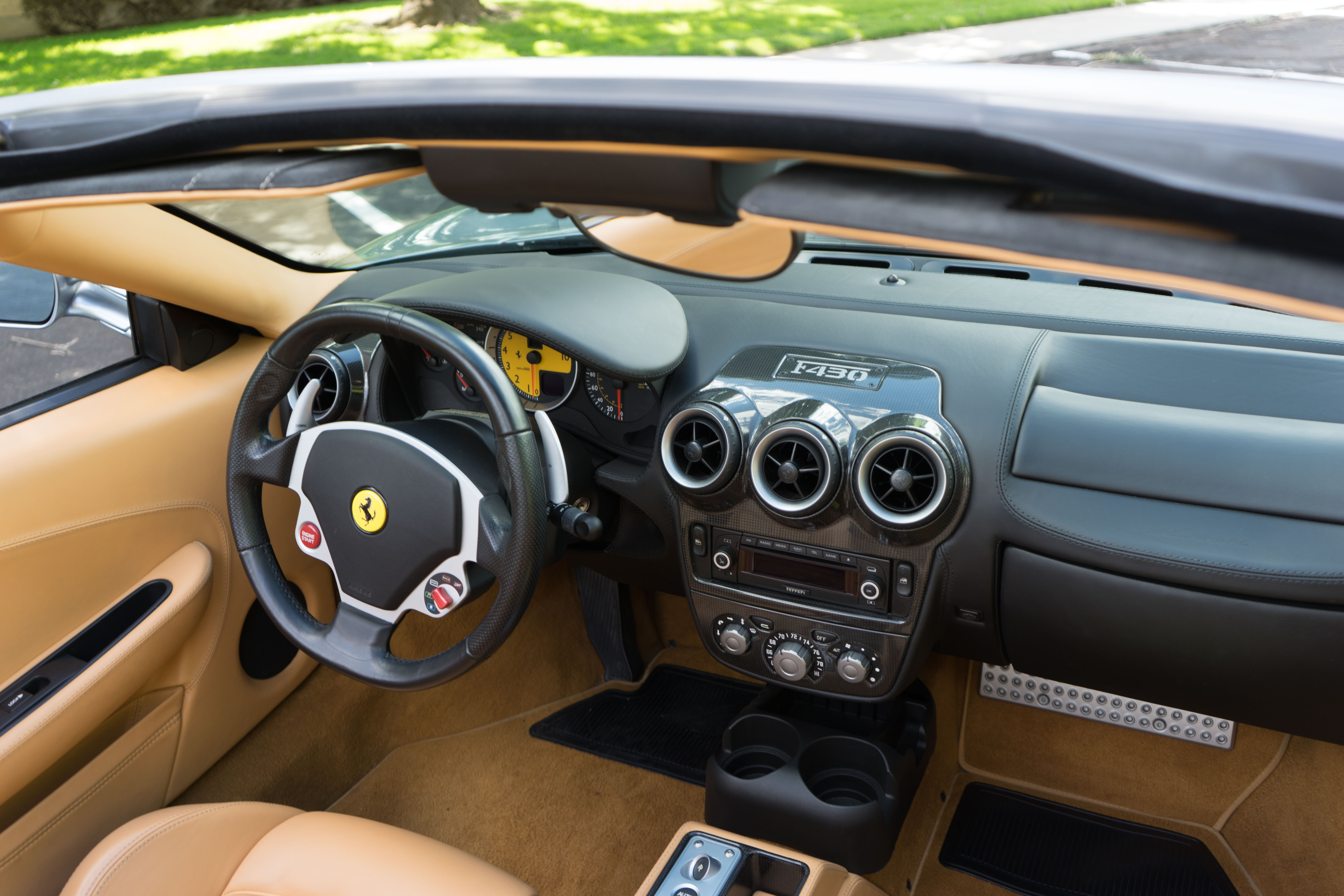 Very attractive and nicely-optioned F430 Spider in Titanium with Tan. Always owned in South Dakota & Colorado, so no salt or excessive heat exposure. Only 11K miles and ordered new by a multi-Ferrari-owning older gentleman; the second owner was a retired engineer, so the car has lived an easy, well cared-for life. Factory options include power Daytona seats, Scuderia shields, silver calipers and front Challenge grilles.