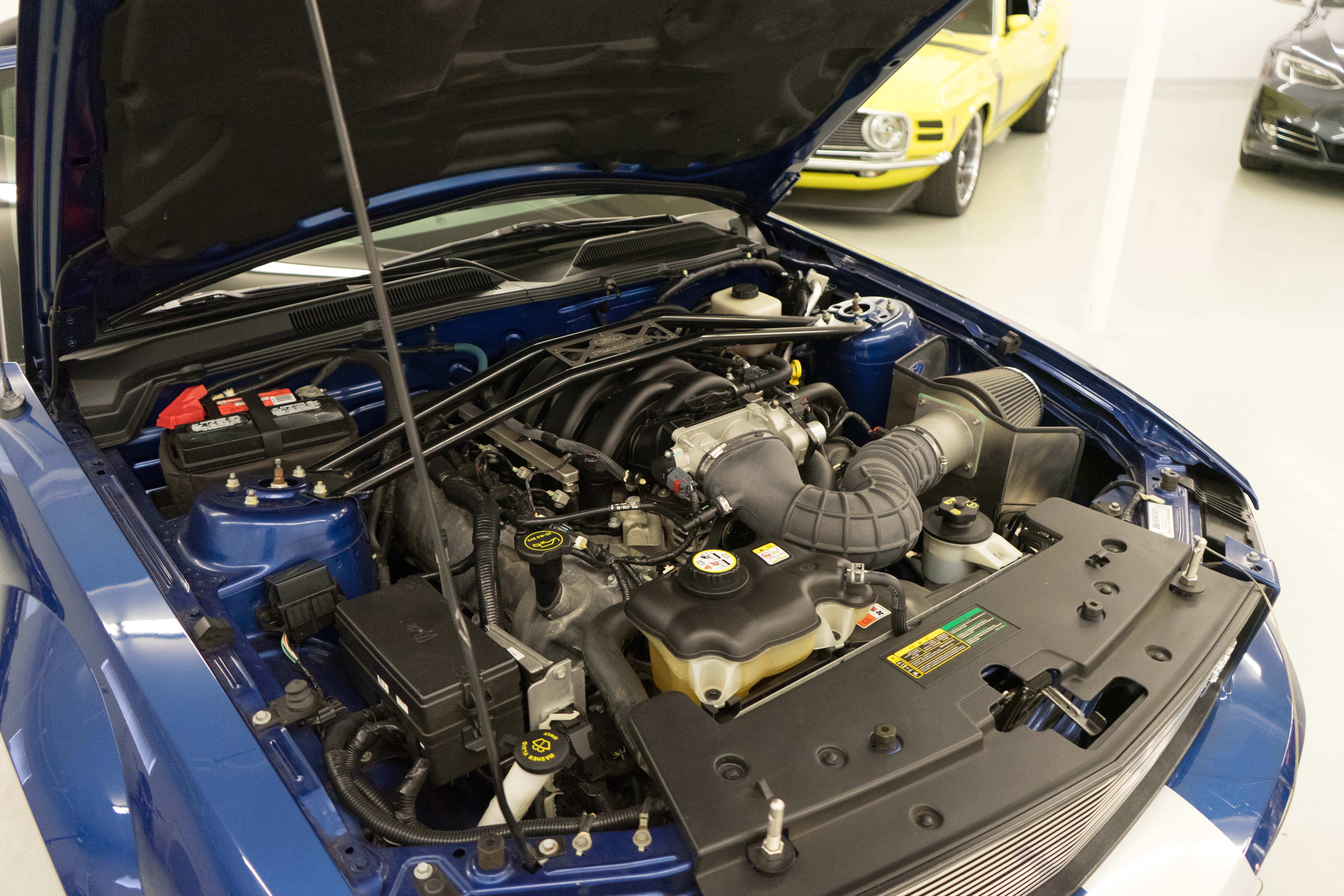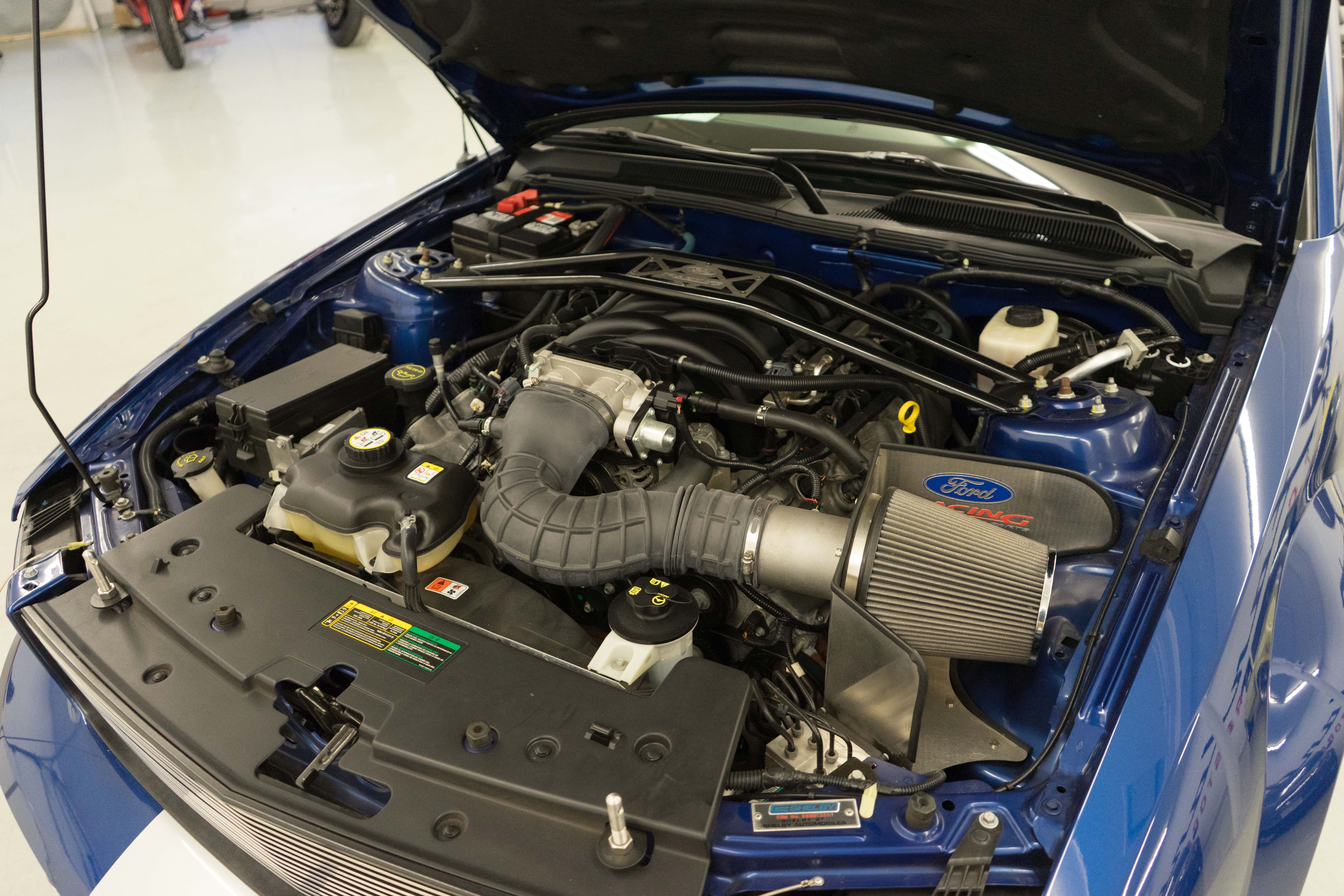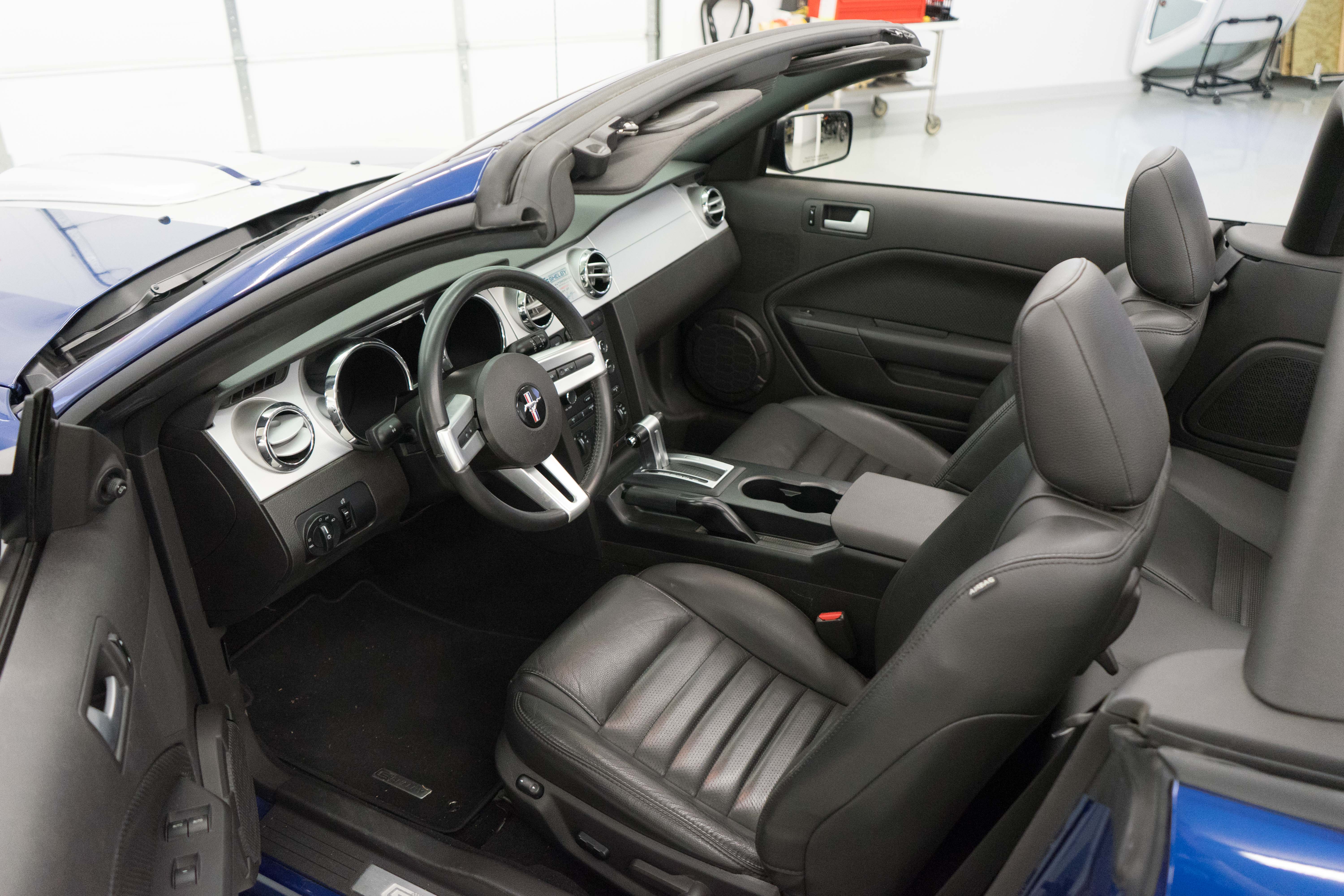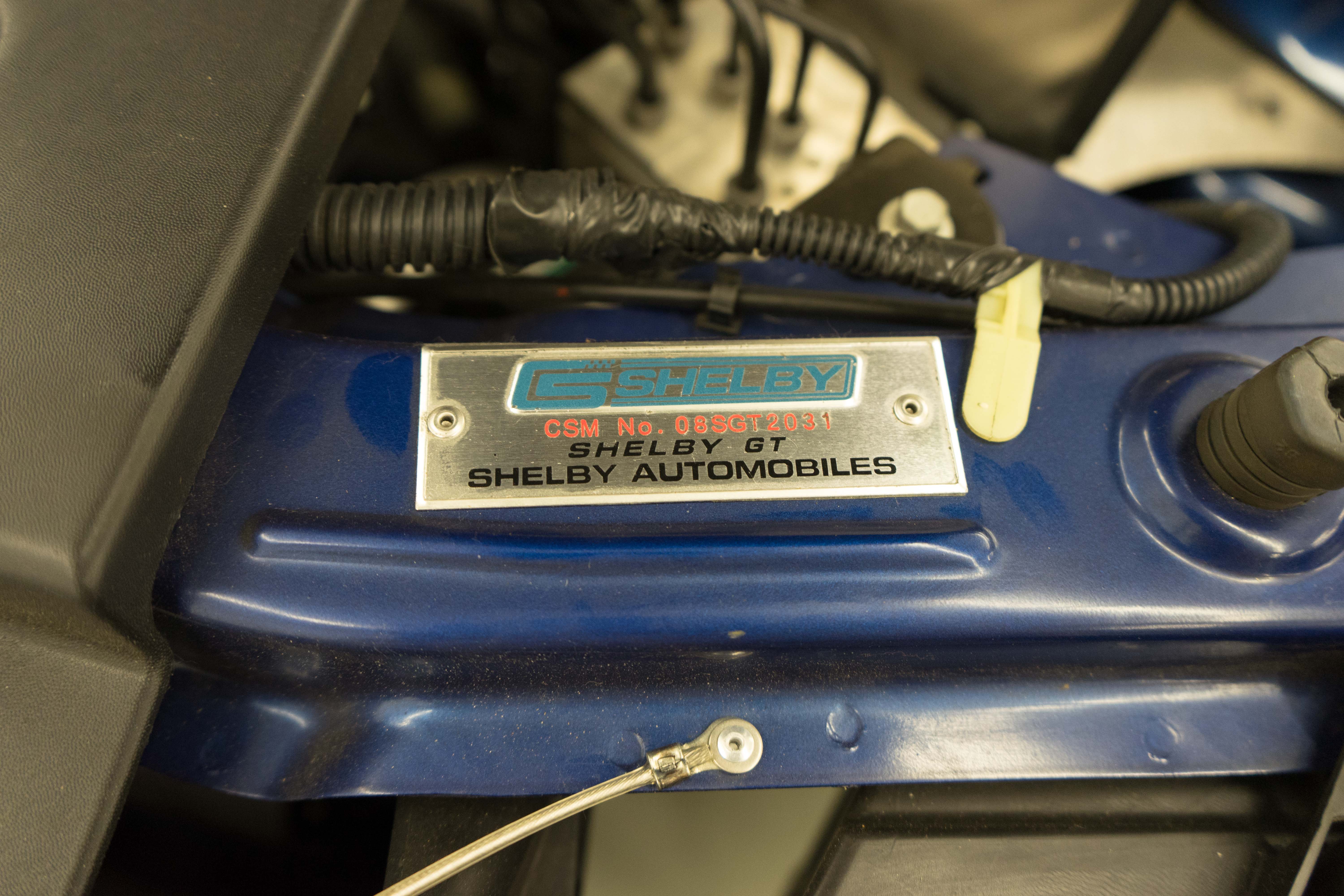 One of the ‘real’ Shelby GTs done at the Shelby American plant in Las Vegas when a new car. All ’08 convertibles were Vista Blue & Black, but not all had the same options. This car has the cold air intake, strut tower reinforcement, limited slip diff and the low-restriction exhaust among other features.