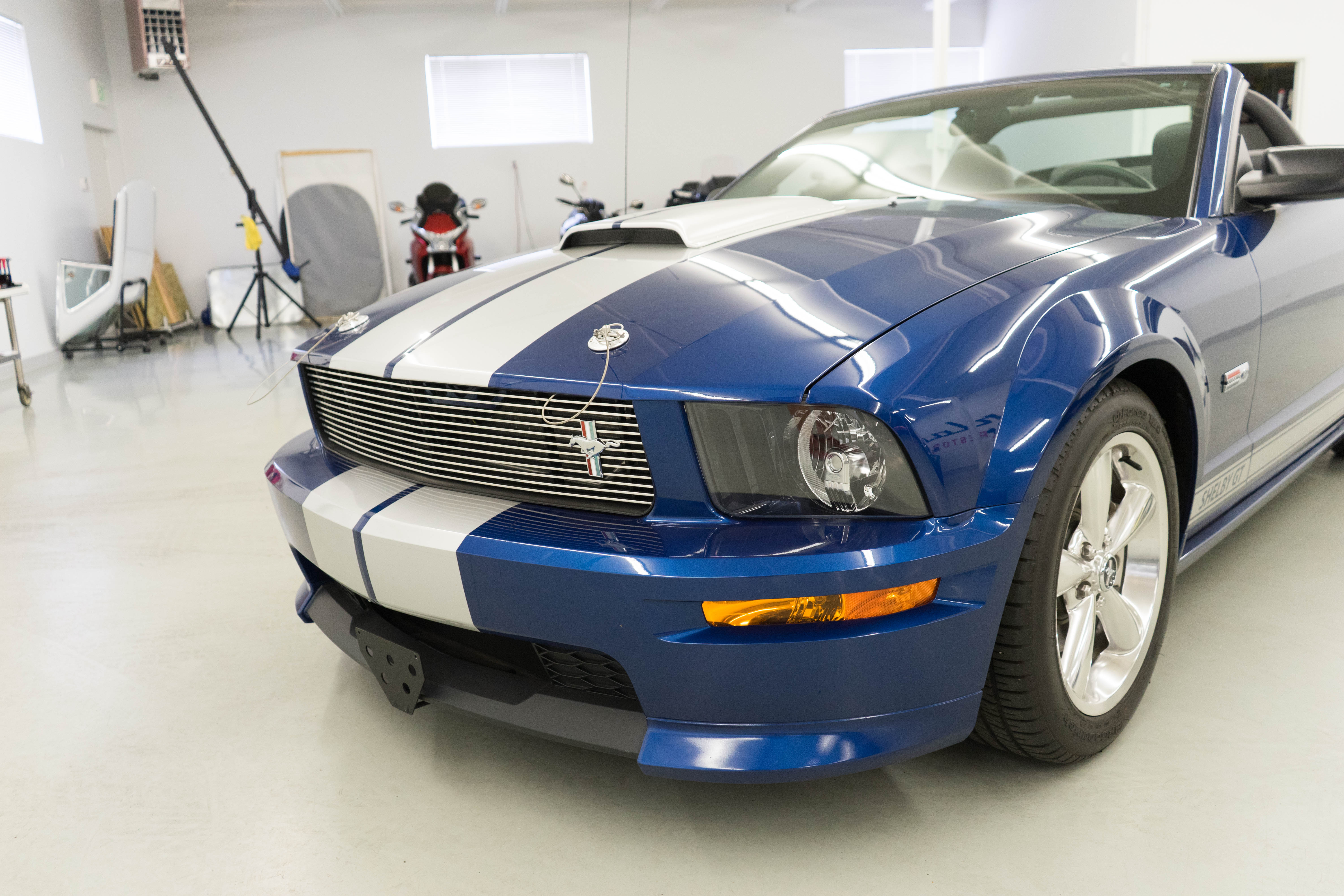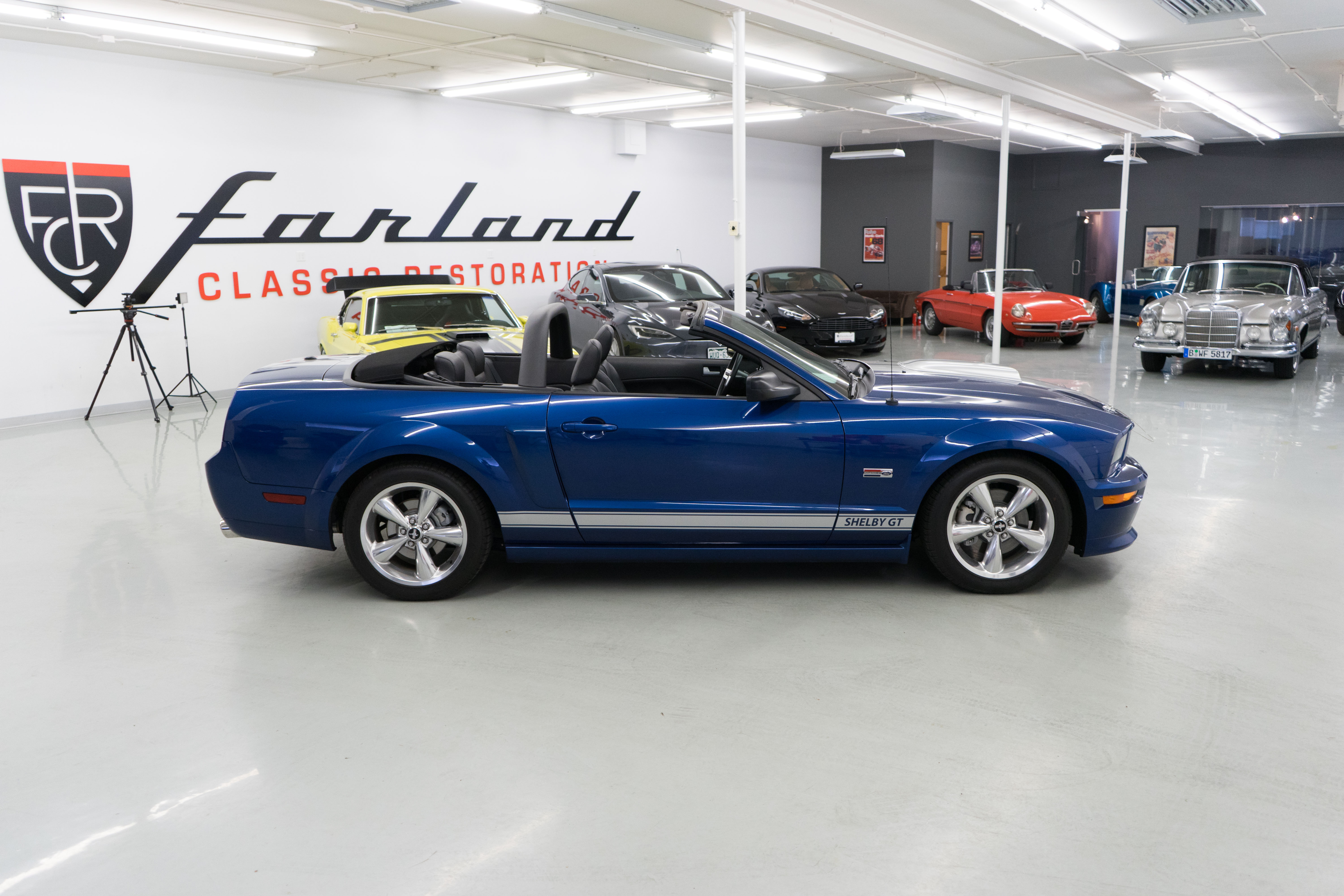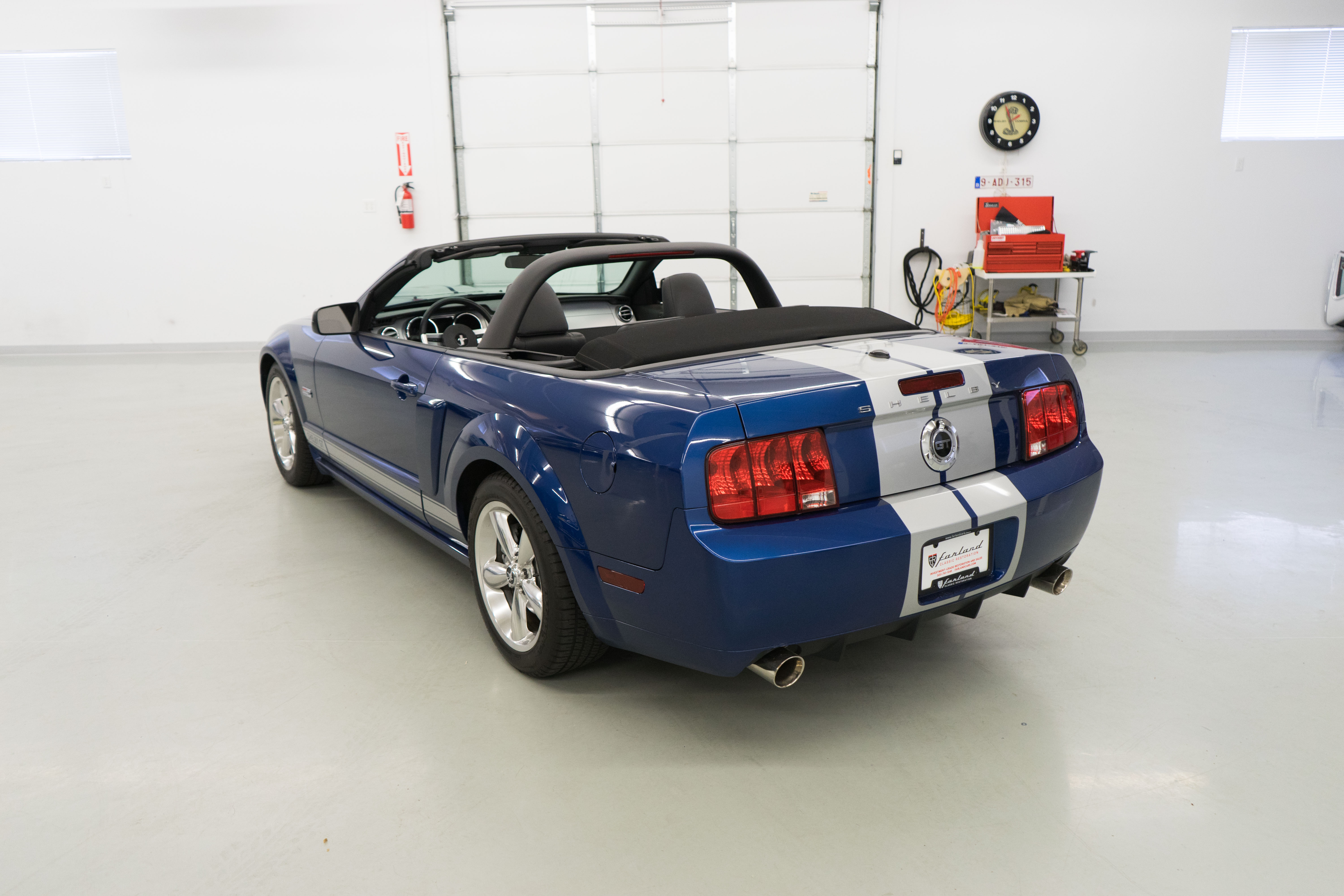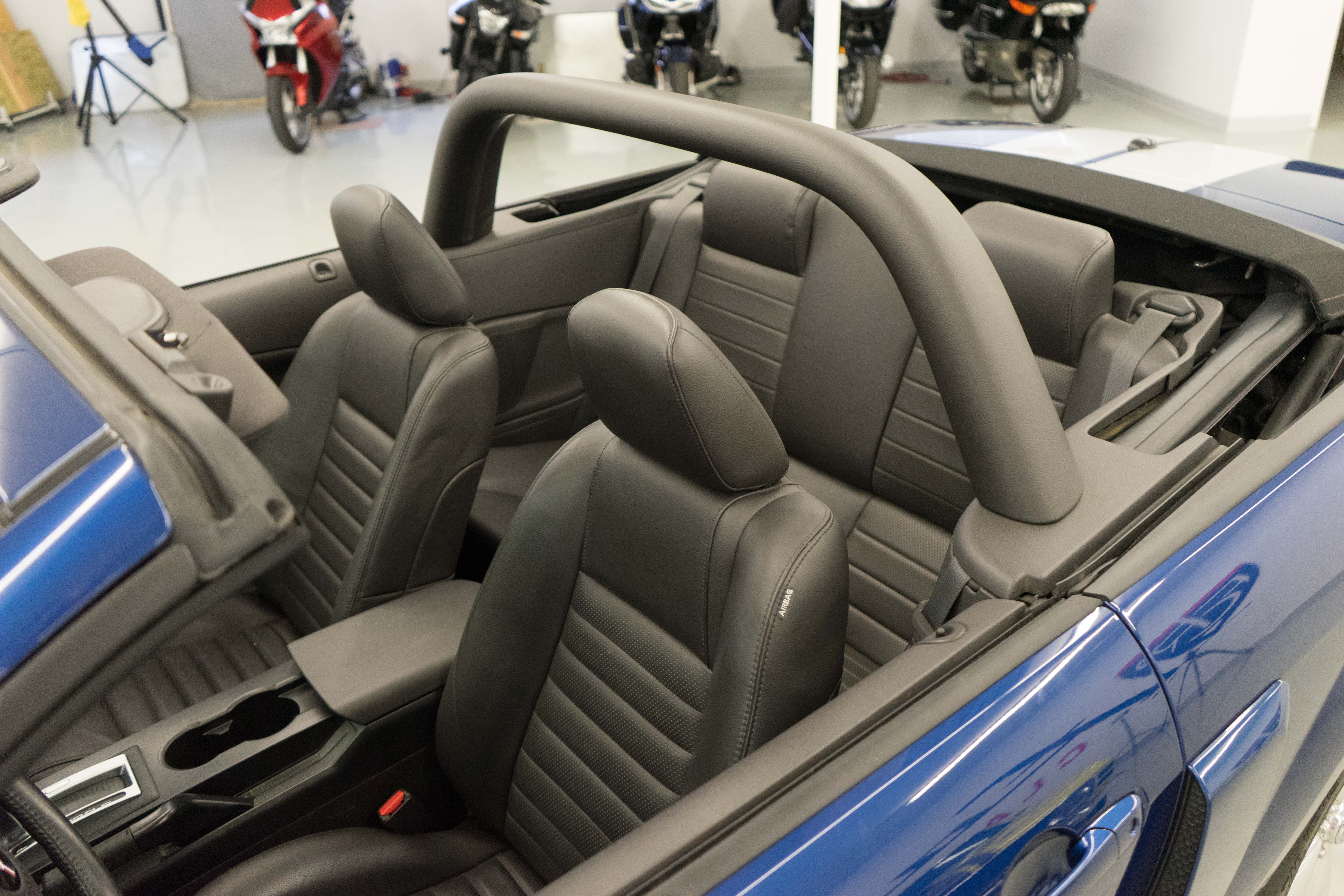 One of the ‘real’ Shelby GTs done at the Shelby American plant in Las Vegas when a new car. All ’08 convertibles were Vista Blue & Black, but not all had the same options. This car has the cold air intake, strut tower reinforcement, limited slip diff and the low-restriction exhaust among other features.