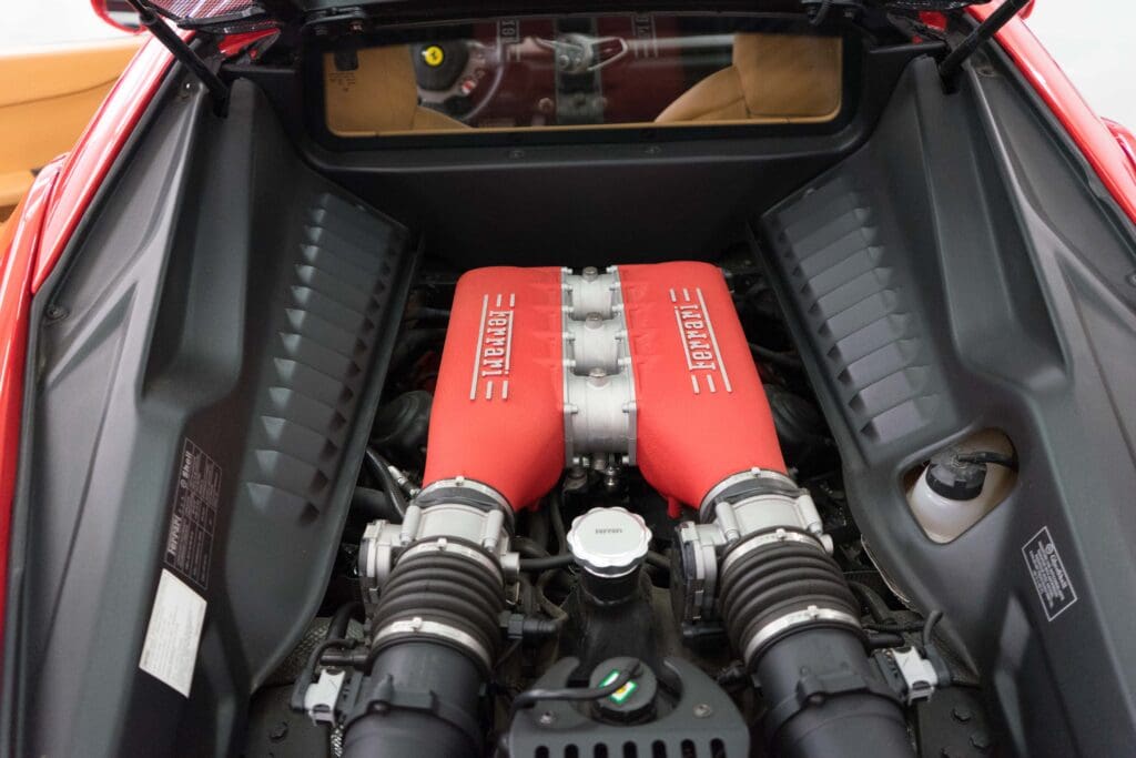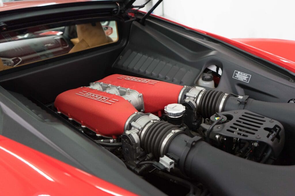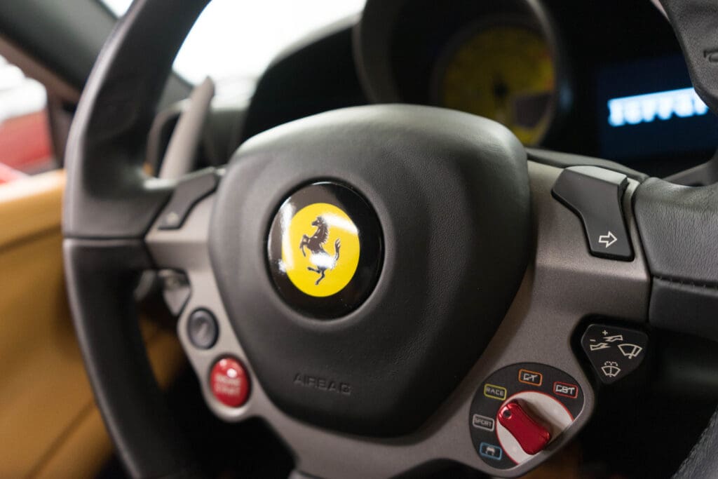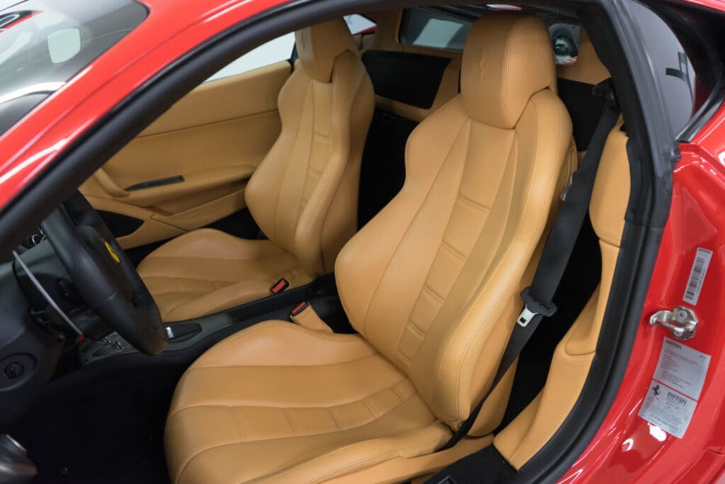 Originally ordered with popular options including 20ā sport wheels, Ferrariās high-power sound system, full power seats, Scuderia shields and aluminum-colored calipers plus a few more features. Fortunately, black carpets were specified instead of the odd beige-colored ones usually fitted with Tan leather for a much better look inside.